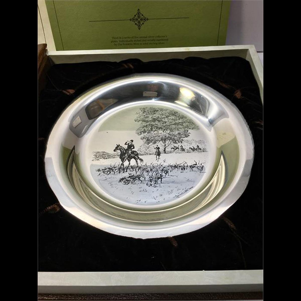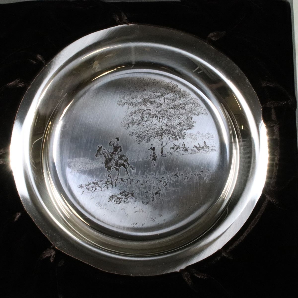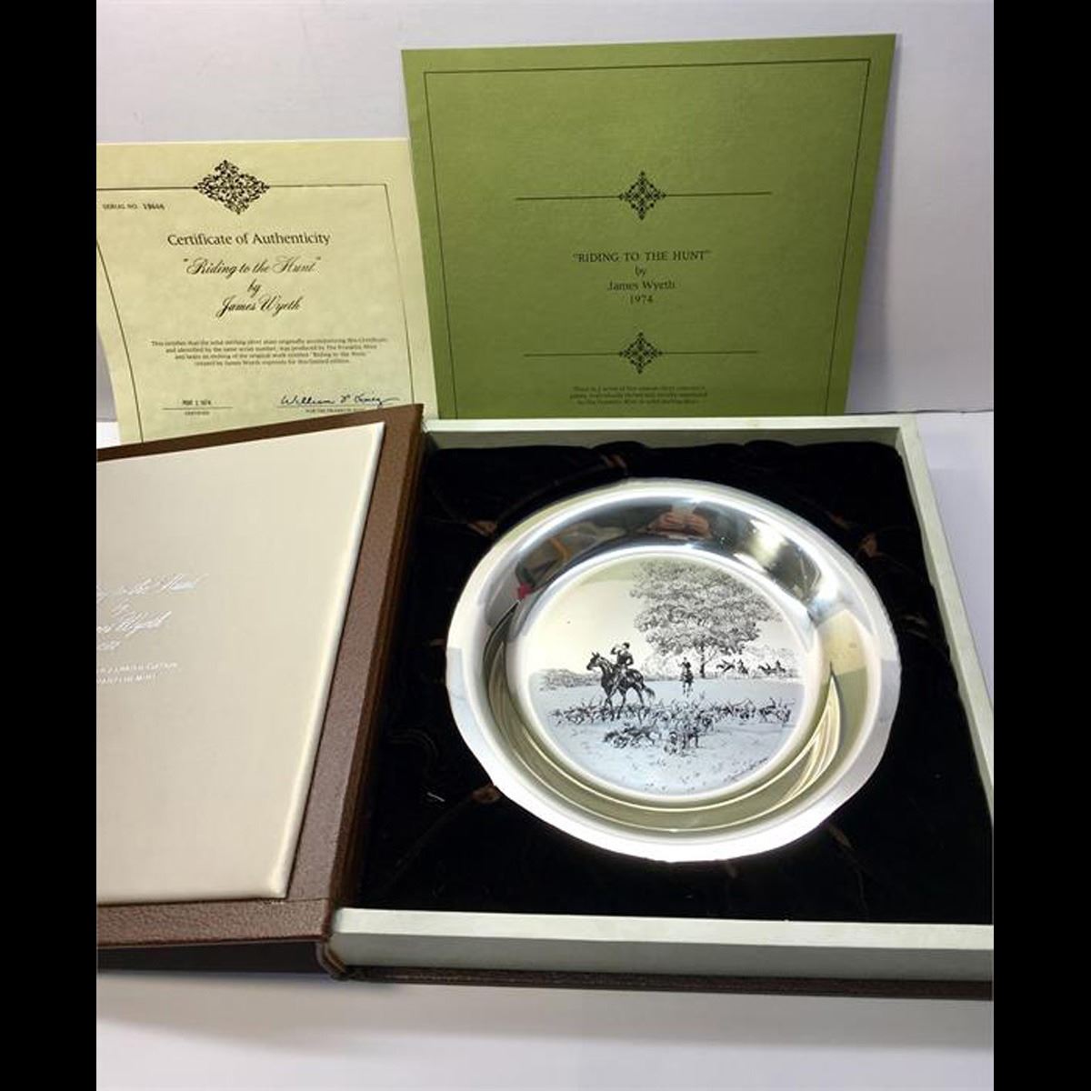 Riding To The Hunt By James Wyeth 1975 Solid Sterling Silver Bowl 6.1 OZ Box & Papers . .. This is beautiful sterling silver collector plate that was minted by the Franklin Mint in 1974 and it features the artwork of James Wyeth -Riding To The Hunt This Limited Edition series plate is serial number 3502 The plate is solid Sterling Silver . It weighs approximately 190 grams or 6.5 ounces and measures 8 inches across. It features the artwork by James Wyeth of skaters on the Brandywine. It is beautifully etched with great detail. The plate is signed with the signature of James Wyeth 1975 . The back of the plate reads: , James Wyeth - 1975, Etched in Solid Sterling Silver, Limited Edition, 3502 © 1975 James Wyeth. This is an excellent quality collector plate that is in beautiful uncirculated condition. There are no scratches, dents, or problems with the plate. It comes in the original velvet lined binder box which is in excellent condition. This plate has been in storage since 1975. All of the paperwork and Certificate of Authenticity (COA) are also included still in the plastic wrapping.