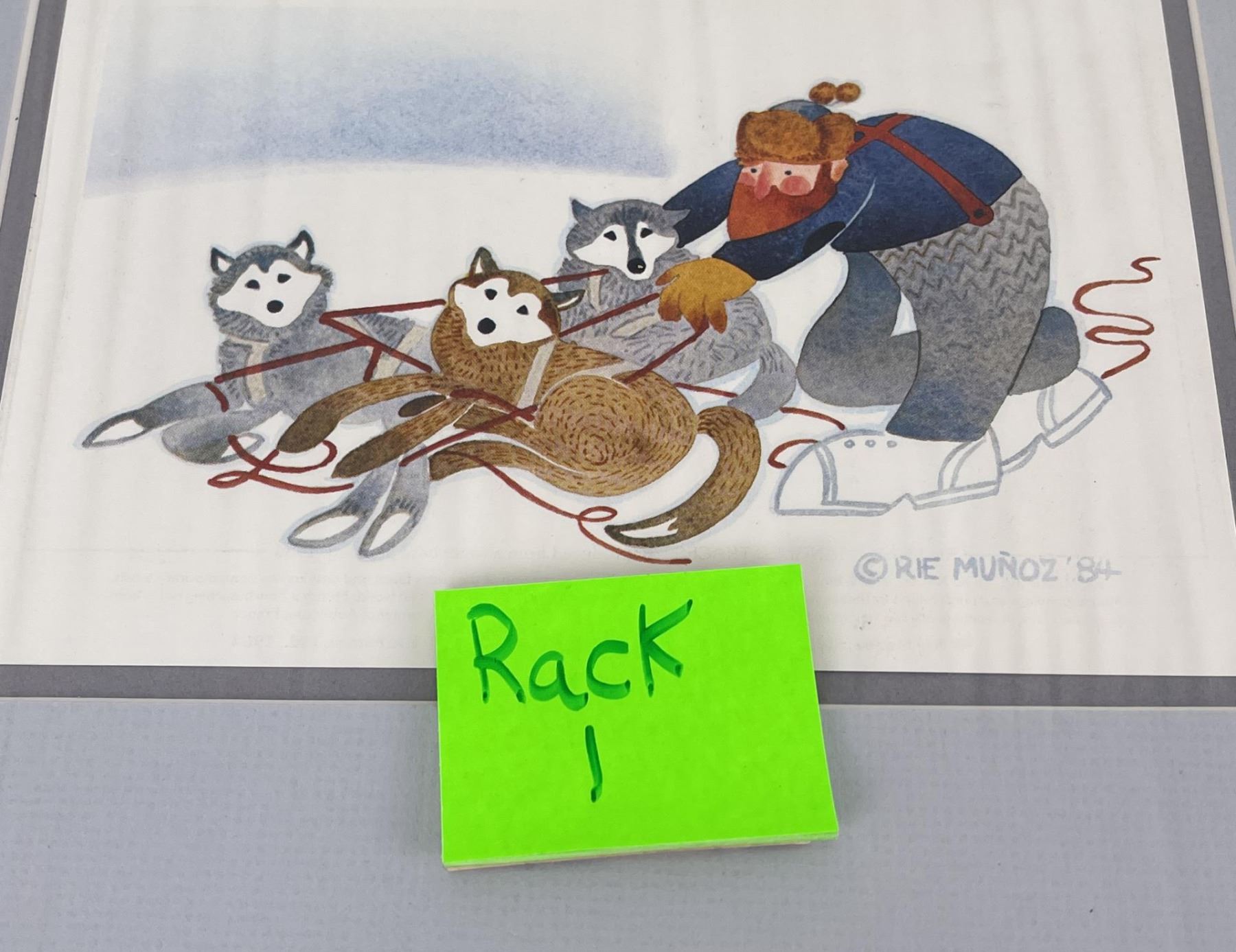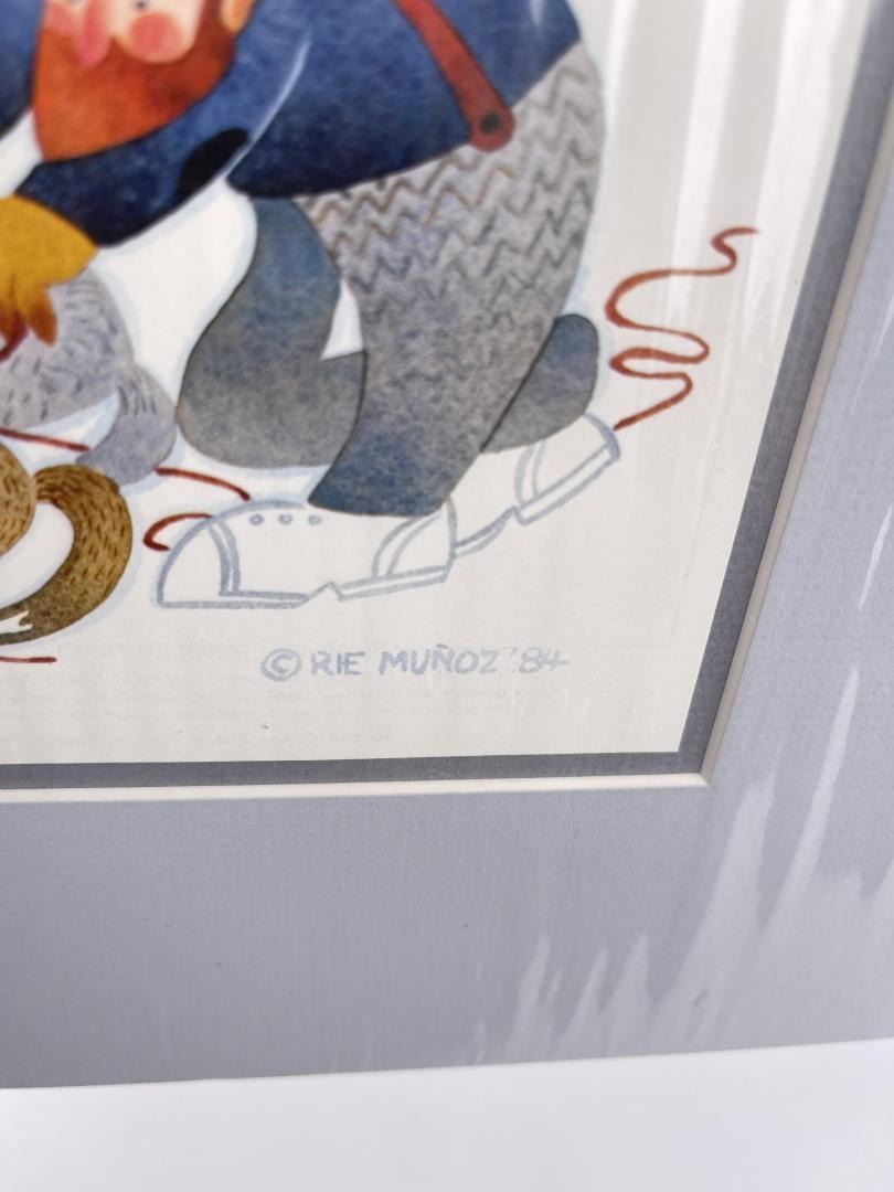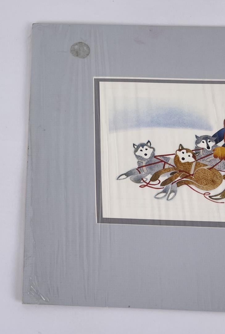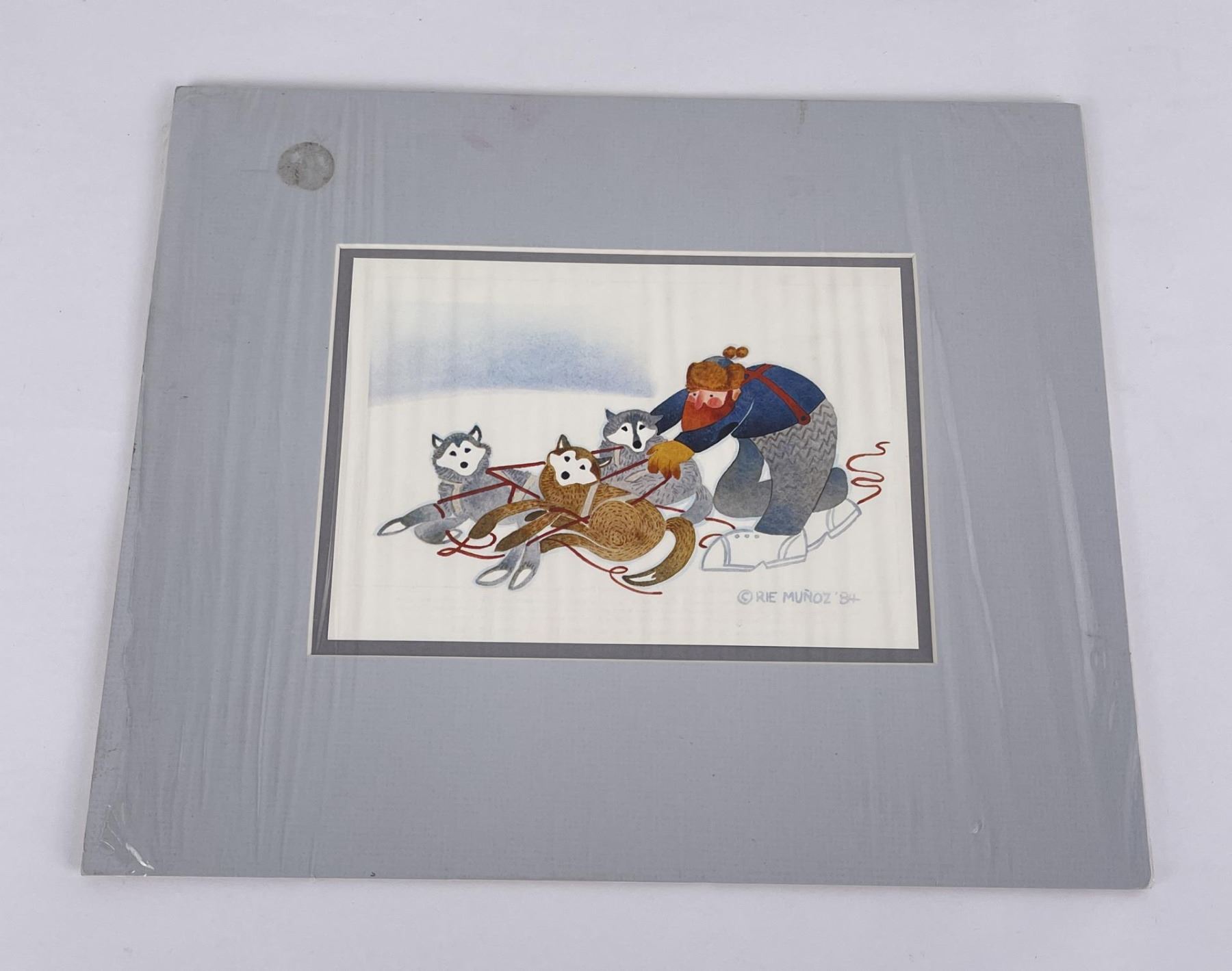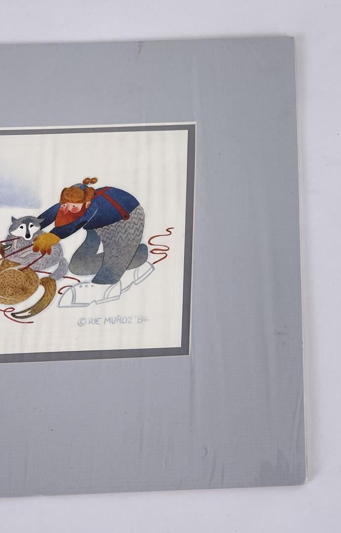 10" by 12" on matte. Alaska regionalist painter Rie Mounier Munoz was the child of Dutch parents who immigrated to California, where she was born and raised. She is known for her colorful scenes of everyday life in Alaska. Rie (from Marie) Munoz (moo nyos), studied art at Washington and Lee University in Virginia. In 1950, she traveled up the Inside Passage by steamship, fell in love with Juneau, and gave herself until the boat left the next day to find a job and a place to live. Since then Juneau has been home to Munoz. She began painting small vignettes of Alaska soon after arriving in Juneau, and also studied art at the University of Alaska-Juneau. Munoz painted in oils in what she describes as a "painstakingly realistic" style, which she found stiff and "somewhat boring." Her breakthrough came a few years later when an artist friend introduced her to a versatile, water-soluble paint called casein. The immediacy of this inexpensive medium prompted an entirely new style. Rie's paintings became colorful and carefree, mirroring her own optimistic attitude toward life. With her newfound technique she set about recording everyday scenes of Alaskans at work and at play. Of the many jobs she has heldjournalist, teacher, museum curator, artist, mother, Munoz recalls one of her most memorable was as a teacher on King Island in 1951, where she taught 25 Eskimo children. The island was a 13-hour umiak (a walrus skin boat) voyage from Nome, an experience she remembers vividly. After teaching in the Inupiat Eskimo village on the island with her husband during one school year, she felt a special affinity for Alaska's Native peoples and deliberately set about recording their traditional lifestyles that she knew to be changing very fast. For the next twenty years, Rie practiced her art as a "Sunday painter," in and around prospecting with her husband, raising a son, and working as a freelance commercial artist, illustrator, cartoonist, and curator of exhibits for the Alaska State Museum. During her years in Alaska, Munoz has lived in a variety of small Alaskan communities, including prospecting and mining camps. Her paintings reflect an interest in the day-to-day activities of village life such as fishing, berry picking, children at play, as well as her love of folklore and legends. Munoz says that what has appealed to her most were "images you might not think an artist would want to paint," such as people butchering crab, skinning a seal, or doing their laundry in a hand-cranked washing machine. In 1972, with her hand-cut stencil and serigraph prints selling well in four locations in Alaska, she felt confident enough to leave her job at the Alaska State Museum and devote herself full time to her art. Freed from the constraints of an office job, she began to produce close to a hundred paintings a year, in addition to stone lithograph and serigraph prints. From her earliest days as an artist, Rie had firm beliefs about selling her work. First, she insisted the edition size should be kept modest. When she decided in 1973 to reproduce Eskimo Story Teller as an offset lithography print and found the minimum print run to be 500, she destroyed 200 of the prints. She did the same with King Island, her second reproduction. Reluctantly, to meet market demand, she increased the edition size of the reproductions to 500 and then 750. The editions stayed at that level for almost ten years before climbing to 950 and 1250. Munoz also believed her art should remain accessible to the people who provide the subject matter for her paintings, -the cannery workers and fishermen and residents of rural Alaska. Her first stencil prints sold for $9 and $12 when they were issued in 1969 and 1970. With few exceptions, new releases were still priced at $50 or less ten years later. Her work has been exhibited many solo watercolor exhibits in Alaska, Oregon and Washington State, including the Charles and Emma Frye Art Museum, Alaska State Museum in Juneau, Anchorage Historical and Fine Arts Museum, Tongass Historical Museum in Ketchikan, and Yukon Regional Library in Whitehorse; Yukon Territory, and included in exhibits at the Smithsonian Institute and Russell Senate Office Building in Washington, D.C. Munozs paintings have graced the covers of countless publications, from cookbooks to mail order catalogs, and been published in magazines, newspapers, posters, calendars, and two previous collections of her work: Rie Munoz, Alaskan Artist (Alaska Northwest Publishing Company, 1984) and Rie Munoz, Artist in Alaska (Rie Munoz Ltd., 1987). Galleries throughout the U.S. and Canada, as well as in Norway, Japan, England, and Holland carry her reproductions and original prints. Although Rie usually paints Alaskan subjects, collectors of her work live across the nation. Many collect thematically, such as focusing on images of Russian churches, for example, or all the bird prints, or the self-portraits. Now in her seventies, Rie completes fifty to sixty paintings a year and selects ten to fifteen of themthe "ones I like best"for reproduction into offset lithography prints. She travels from her Juneau home on frequent sketching trips and to seclude herself in one of her cabins to paint. She works hard, considering four hours of painting a day the minimum for maintaining her craft.