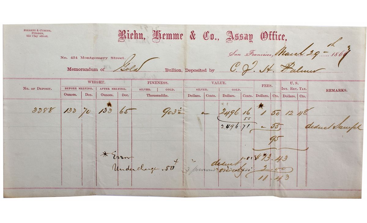 c Memorandum of Gold Bullion Deposited by C.T.H. Palmer. Receipt totaling $11.43. There is some creasing, but otherwise this piece is in Fine condition. This assay office bullion receipt is Extremely Rare, R7, perhaps one of six known, none of which are signed by Reihne & Hemme. This particular receipt is for a gold bullion bar deposited by Banker, C.T.H. Palmer of Folsom, CA. Palmer handled much of the placer gold produced from the region around Folsom including famous locals such as the Mormon Bar. This assay receipt is for a gold ingot weighing 133.70 oz with a fineness of .903 valued at $2496.16. it is dated 3/29/1867. The receipt itself has been trimmed. It is printed in bright red ink, an unusual attribute, by Sterett and Cubery Printers of San Francisco At present there are only three Reihne, Hemme & Company precious metals ingots known to us. From the John J. Ford, Jr. Collection. - HKA#65779