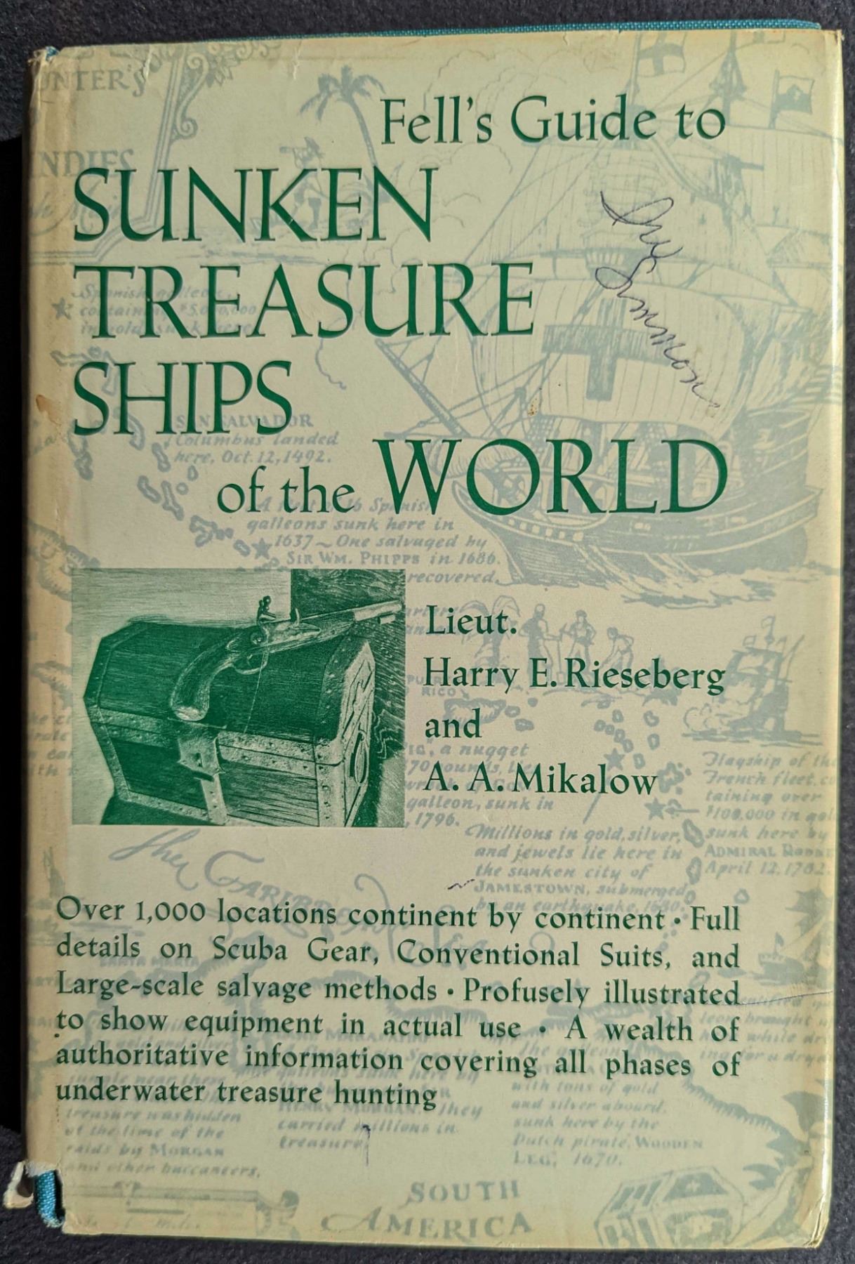 Rieseberg, Lieut. Harry E., and A. A. Mikalow. FELL'S GUIDE TO SUNKEN TREASURE SHIPS OF THE WORLD. Frederick Fell Inc. 1965. 12mo. (18), 221, (5) pages. New York. first edition. original seagreen cloth, gilt; chipped, unclipped dust jacket. illustrations. tables. xeroxed errata sheet laid in. near Fine. This is a handbook devoted to treasure salvage, co-authored by two of the most successful treasure hunters and undersea explorers in the world. This book list over 1,000 locations with vital facts on each treasure vessel that includes: ship nationality and type of rigging, date of loss, itemized cargo loss in gold bullion, silver, and other valuable artifacts, exact location of sinking, what, if anything has been salvaged to date and what remains for the modern hunter. Lot weight: 1 lbs 1oz. Subject(s): Sunken Treasure.