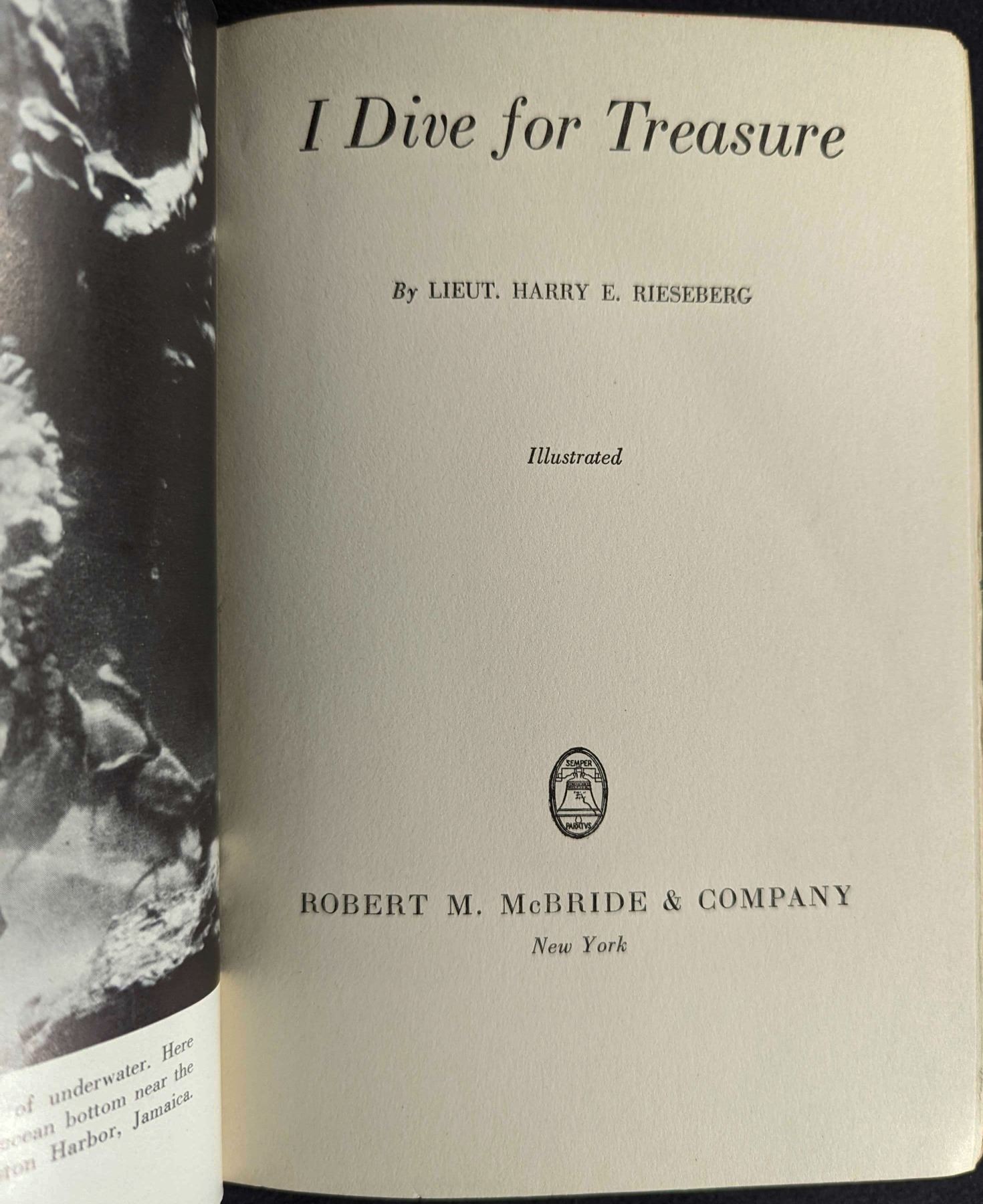 Rieseberg, Lieut. Harry E. I DIVE FOR TREASURE. Robert M. McBride & Company. 1944. 8vo. (4), 331, (7) pages. New York. forth printing. original blue-green cloth, gilt. frontispiece. illustrations. tables. near Fine. The author tells true accounts of thrilling underwater adventures in the search for millions of dollars' worth of sunken treasures. Lieut. Rieseberg also shares many valuable tips for treasure-hunters as well as the names and locations of buried shipwrecks. The author is well qualified to tell these exploits because he has lived them and even inspired moviemakers. The book holds the reader's attention as stories of shark, barracuda and giant octopus lurk around the sunken ships. Not only are there these dangers but also the escapes from storms and failed equipment. Lot weight: 1 lbs 10oz. Subject(s): Sunken Treasure.