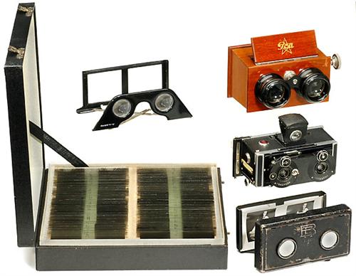 Rietzschel: "Kosmo-Clack" and Accessories Rietzschel, Munich. "Kosmo-Clack", c. 1914. Size 45 x 107 mm, 2 x Doppel Anastigmat Sextar 6,8/65 mm, Compur Stereo shutter, with focusing screen back (no glass). - And: Ica Stereo viewer for slides (nice), size 45 x 107 mm, two metal stereo viewers for prints, size 45 x 107 and case with approx. 76 black and white stereo slides, c. 1926, from the Alpes.<Br>