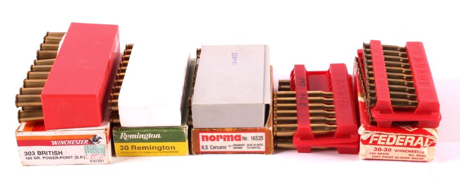 This lot includes several types of rifle ammunition. There are (19) 6.5 Carcano, (16) .270 Winchester, (20) .30 Remington, (20) .30-30 Winchester, and (20) .303 British. All the ammunition is in new, unfired condition.
