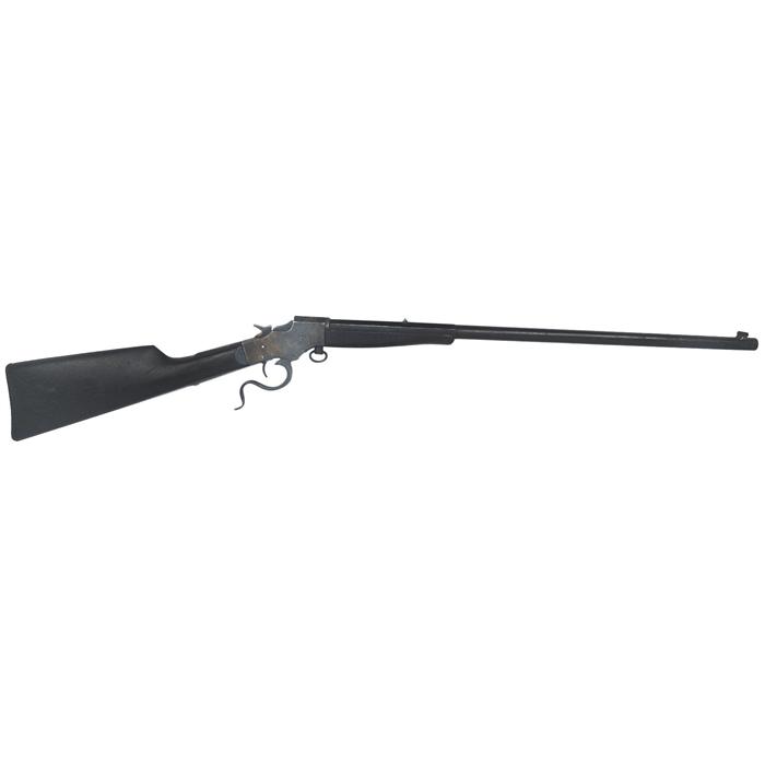 Rifle, Stevens, falling block, single shot, 22 cal, takedown, fixed sights, fire damaged stock, repl