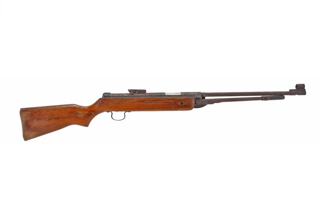 Rifle Type Air Gun Made in China Blued finish mostly rusted, wood stock deteriorated finish but appears sound. Functioning status unknown, as trigger is broken off. Needs work.Blued finish mostly rusted, wood stock deteriorated finish but appears sound. Functioning status unknown, as trigger is broken off. Needs work.