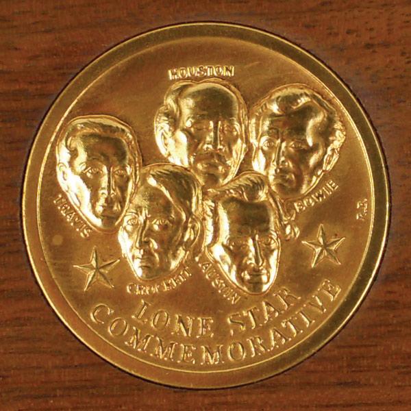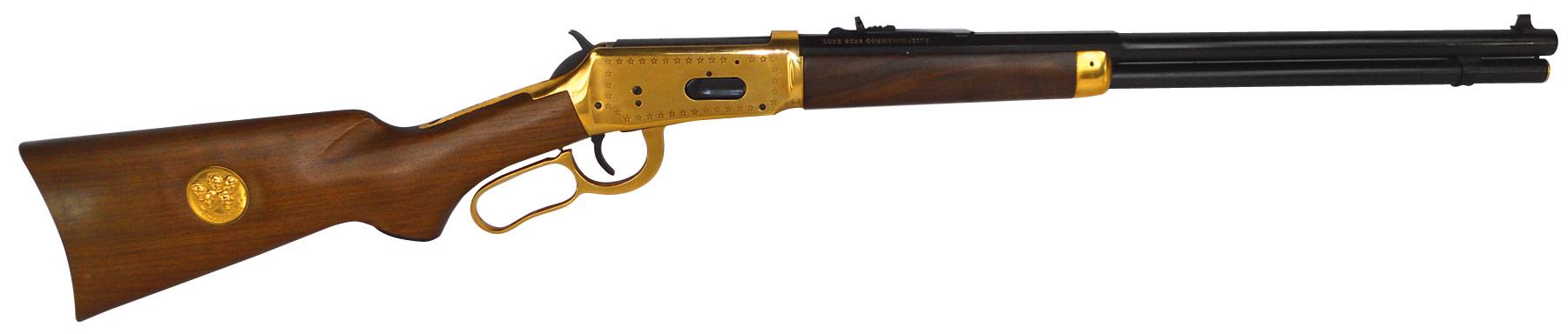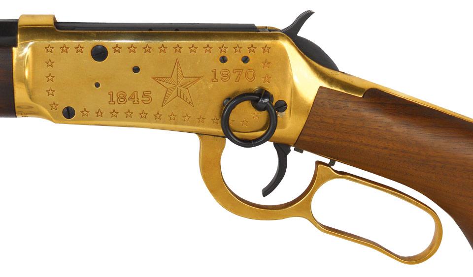Rifle, Winchester '94, "Lonestar Commemorative", 30-30 cal, 26" part-octagonal & part-round barrel, half magazine, marked on left flat of octagonal barrel "Lone Star Commemorative", right side of barrel stamped Winchester Model 94 30-30, left side of frame stamped 1845-1970, engraved stars around border of the frame, tang engraved "Under Six Flags", frame, magazine tube tip, forearm tip & buttplate are gold tipped. S/N LS31599. Unfired w/box.