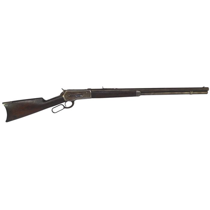 Rifle, Winchester, Model 1886, 45-90, octagonal bbl, crescent steel buttplate, S/N 48614, 26" bbl, ramp adjustable rear sight (missing ramp), even light pitting & scratches on metal surfaces, heavier pitting around action area, appears to operate normally.