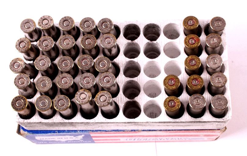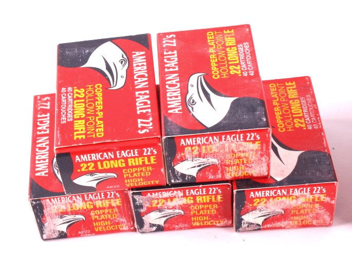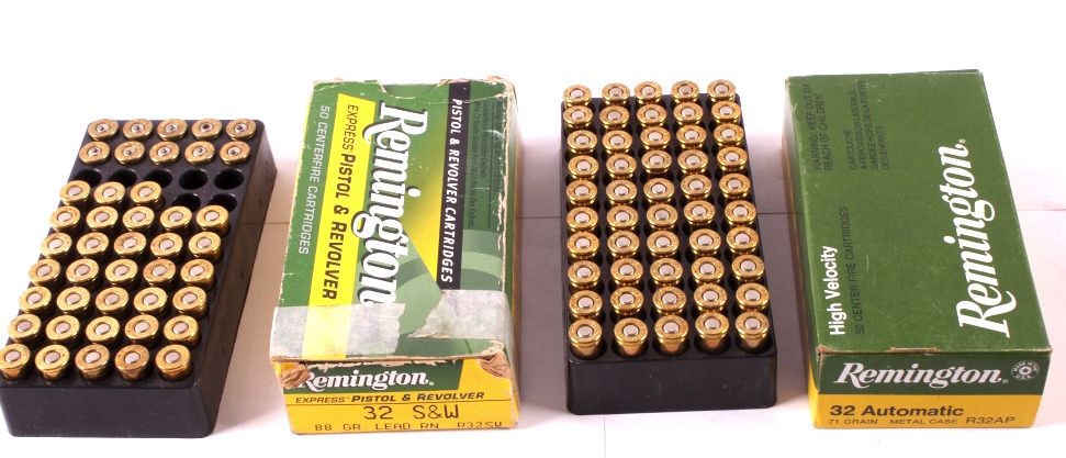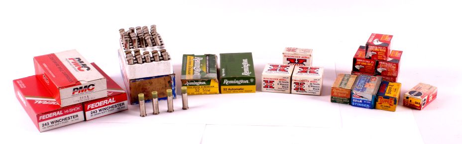 This lot includes several types of rifle and pistol ammunition. There are (100+) .32 S&W blanks, (33) .32 S&W, (50) .32 auto, (25) .357 magnum, (35+) Peters .22 short, (375+) .22 long rifle, including "Stinger" and rifle shot, (4) .38 special rifle shot, and (36) .243 Winchester w/ (24) .243 empty brass.