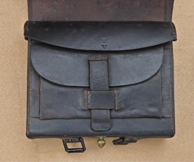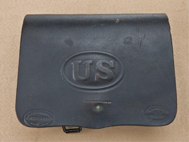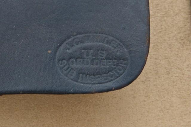 Rifleman’s cartridge box in very good plus to near fine condition in both tin inserts marked E. A. Crossman & Co, Newark NJ in left corner and J.C. Miller, U.S. Ord. Dept, subinspector in right corner, embossed body, no plate, shows both straps, tab, lacquered buckles, just some minor normal aging. Well-marked, at least very good plus overall. Est: $600 - $1,200