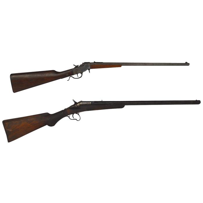Rifles (2), Hopkins and Allen, 32 cal rimfire, underlever, round barrel, takedown, moderate bore, Good cond & Belgian, swing block, octagonal barrel, approx 30 cal rimfire, Fair cond.