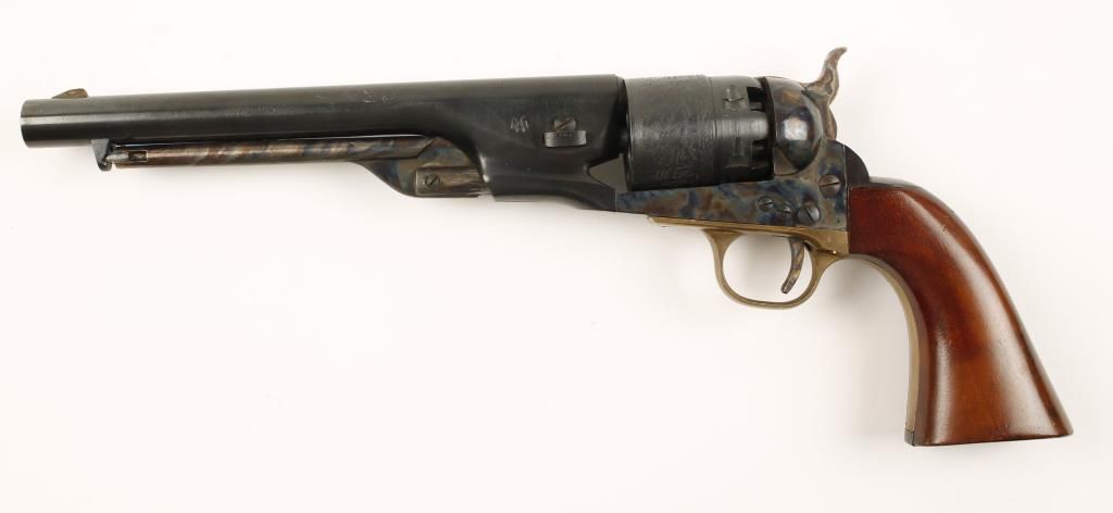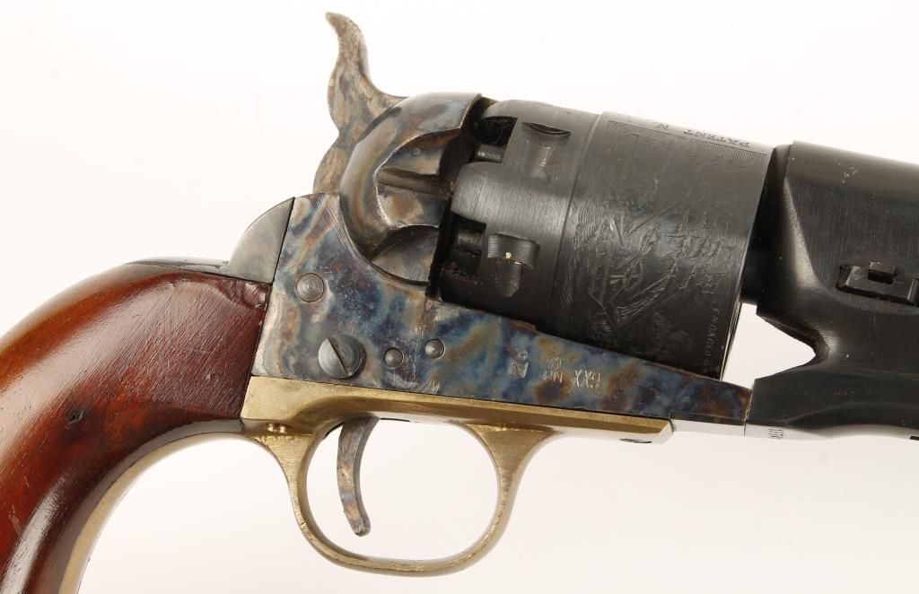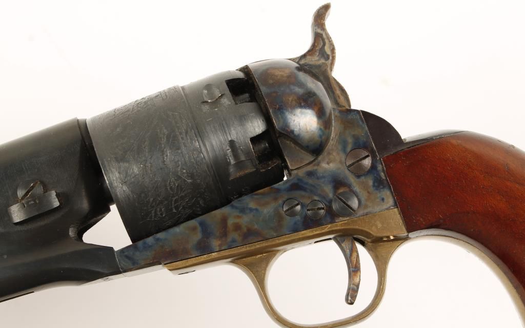 Replica black powder single action 6-shot pistol. 8"blued barrel. Color cased loading lever, frame, hammer and trigger. Blued and engraved cylinder showing sailing vessels. Brass trigger guard. Blued backstrap. Milled for shoulder stock. Condition is very good. *Antique Firearm*