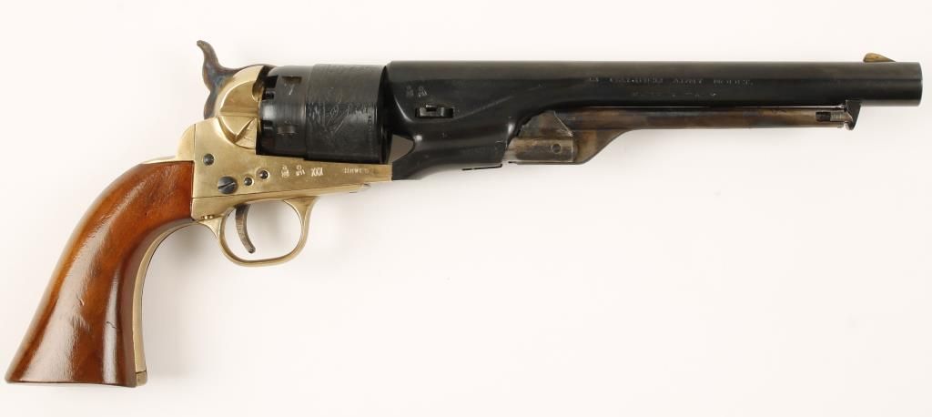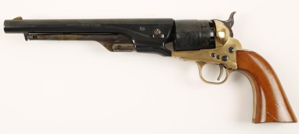 Replica black powder single action 6-shot pistol. 8" blued barrel. case colored loading lever, hammer and trigger. Blued and roll-stamped cylinder showing a naval engagement. Brass frame, trigger guard and backstrap. Cut for a shoulder stock. Condition is very good with few blemishes. *Antique Firearm*