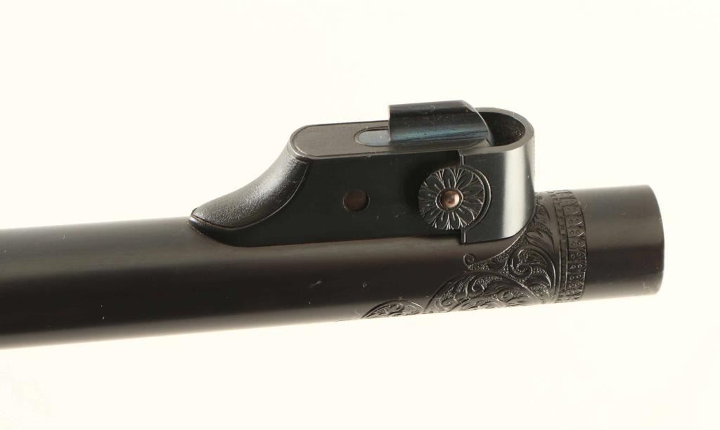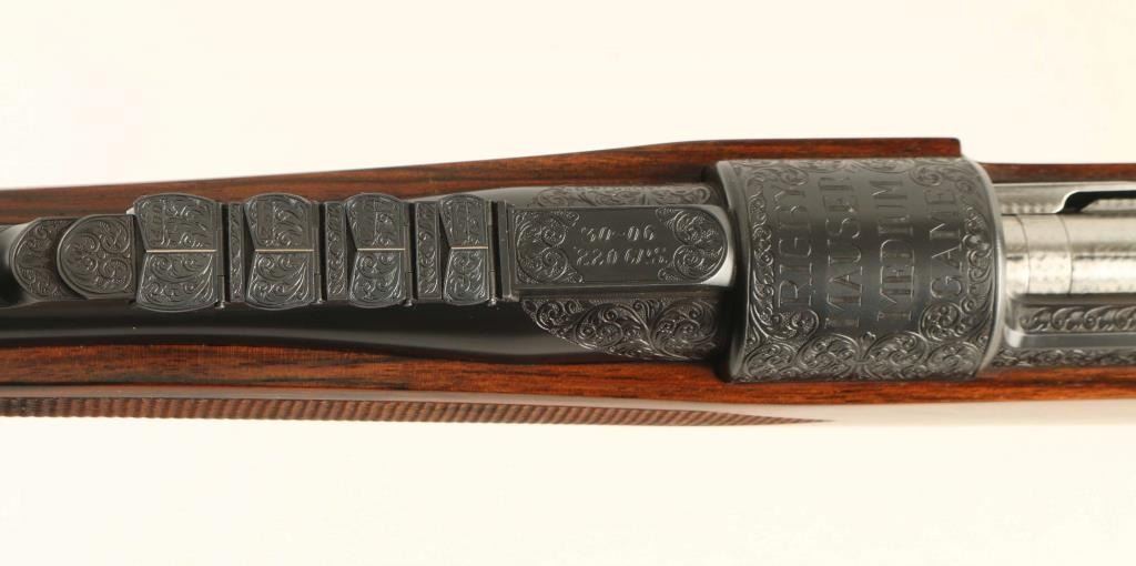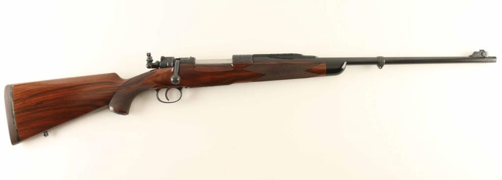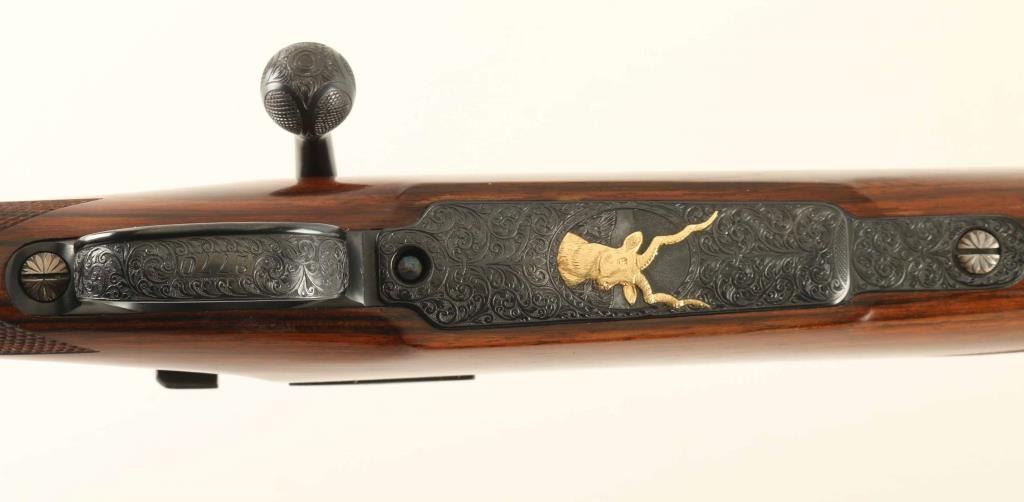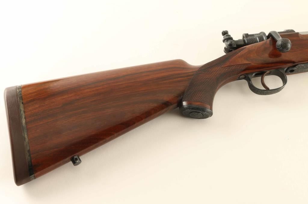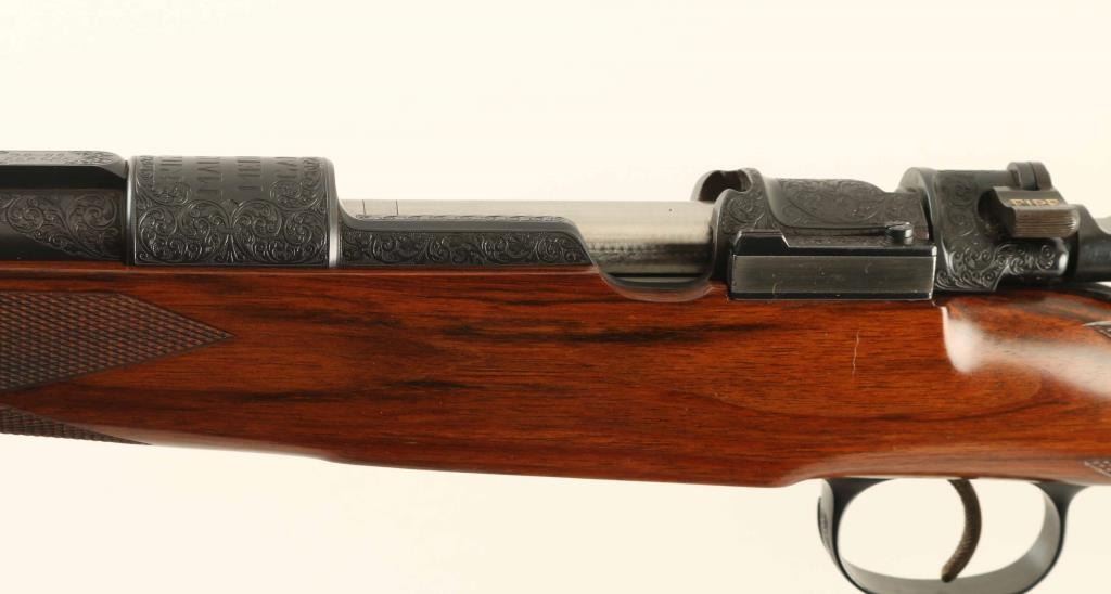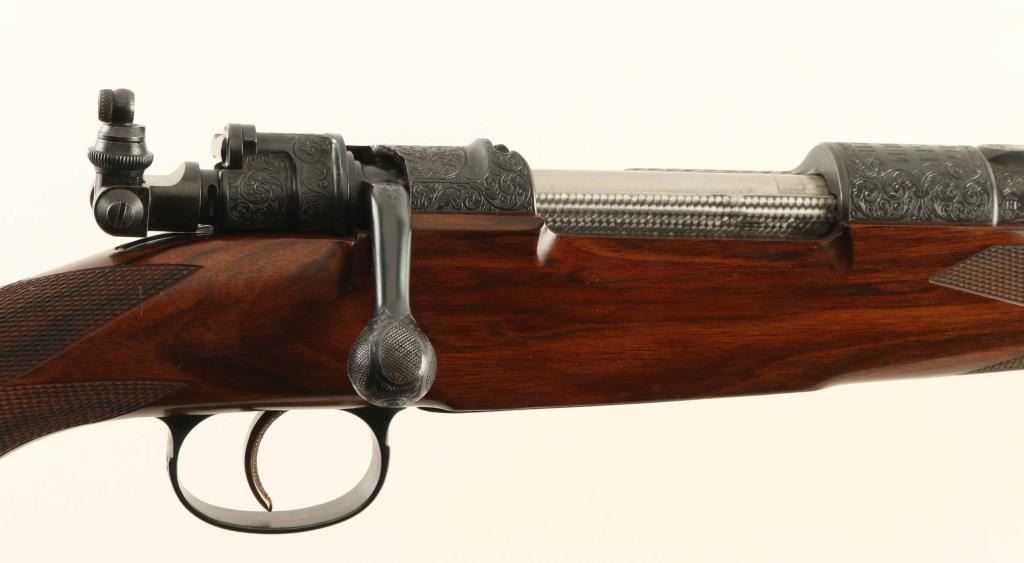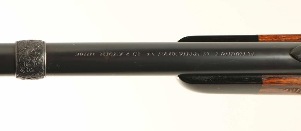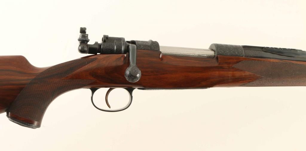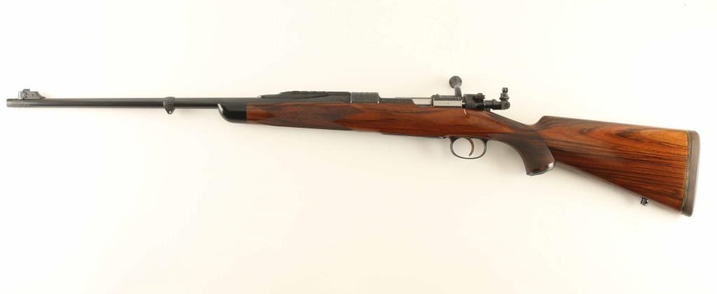 Fantastic, engraved custom medium game bolt action sporting rifle chambered in .30-06 Springfield, built utilizing a Mauser standard length action. Rigby has a long history with Mauser, starting in 1897 when he was awarded a 12 year exclusive distributorship to import & distribute all Mauser made rifles, actions, barreled actions & components into the United Kingdom and British Colonies. Configuration: Blued finish, exquisite acanthus scroll engraving with fine stippled background & gold inlayed Kudu bust on the floorplate, 22" tapered barrel with quarter rib fitted with quadruple drop-leaf express sights marked for 100. 200, 300 & 400 yards, raised bead top blade front sight with flip-up hood, bolt mounted adjustable pep sight by A.G. Parker, knurled trigger, three-position safety gold inlayed with "FIRE" & "SAFE", engine turned bolt & extractor, turned down bolt handle with five panel tear drop pattern knurling on the knob, Mauser standard length action with thumb cut, internal box magazine with polished follower & detachable floorplate, and point checkered select walnut pistol grip shoulder stock with horn forend tip, steel trapdoor grip cap & Pachmayer recoil pad. The barrel is engraved "JOHN RIGBY & Co. 43 SACKVILLE ST. LONDON. W." and the receiver ring reads "RIGBY/ MAUSER/ MEDIUM/ GAME". Rifle exhibits nearly all of its original matte blued finish showing a small spot of discoloration of the bolt mounted peep sight with no observed wear. Action is very smooth, the bore is pristine, markings are crisp and the wood stock is fine. Condition is like NRA Perfect. ***C&R Firearm*** [From the Jim Wilkinson Rifle Ranch Collection]
