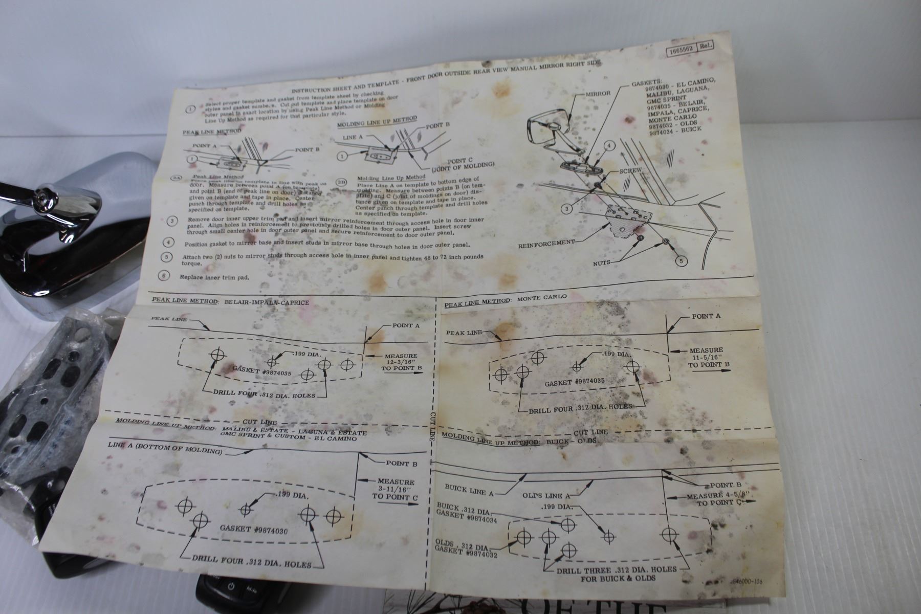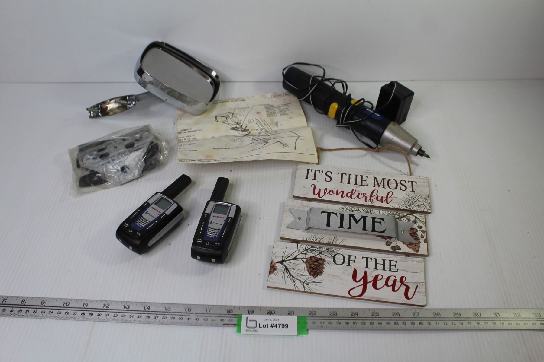 Right Side Mirror w/Template & Model Numbers - Master Craft Power Screw Driver (working) - Saying Wall Hanger - (2) Cobra Micro Talk Radios (untested)