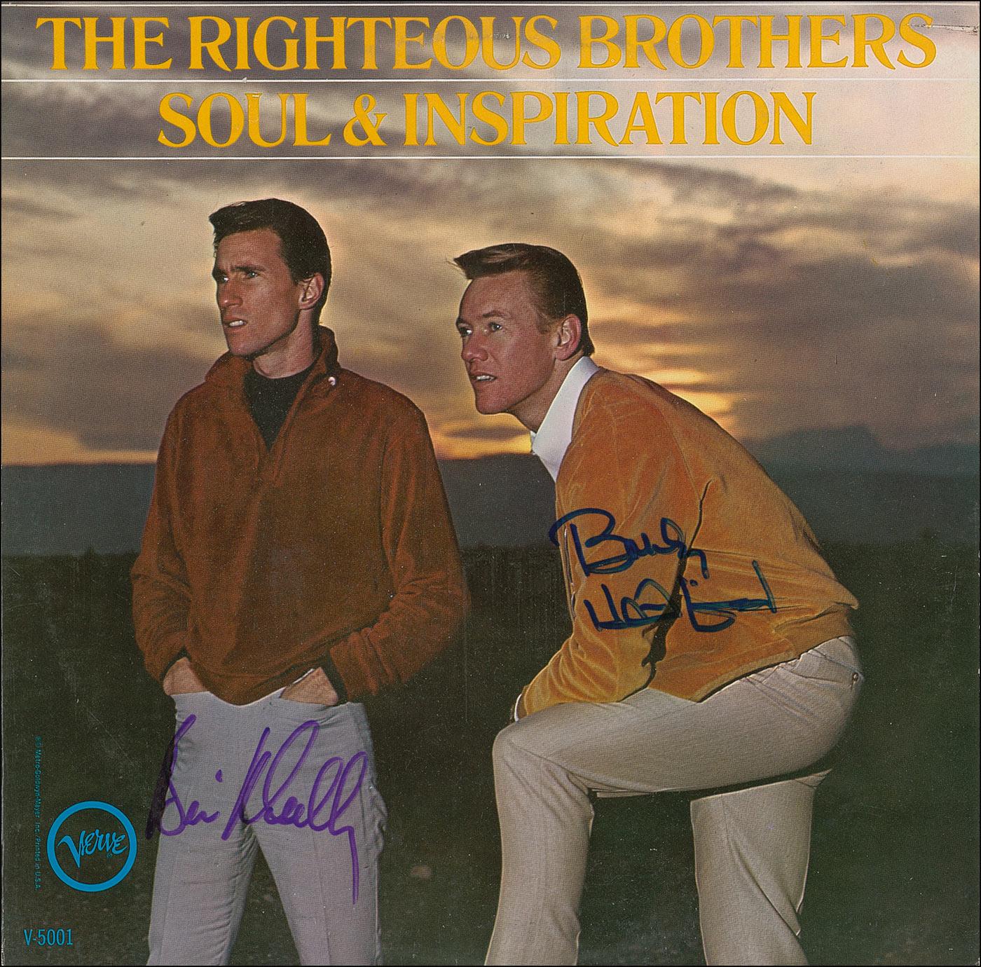 Soul & Inspiration album signed in blue felt tip by Bill Medley and Bobby Hatfield. In fine condition, with a few scuff marks, surface scratches, and a ‘ring of wear.’ The record is not included.