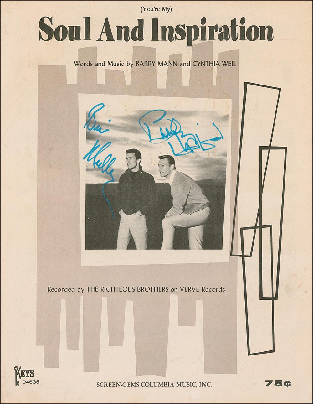 Sheet music for ‘(You’re My) Soul and Inspiration,’ 8.5 x 11, two pages, signed on the front cover in blue ink by Bill Medley and Bobby Hatfield. In very good condition, with scattered creases and wrinkles, as well as some mild damp staining.