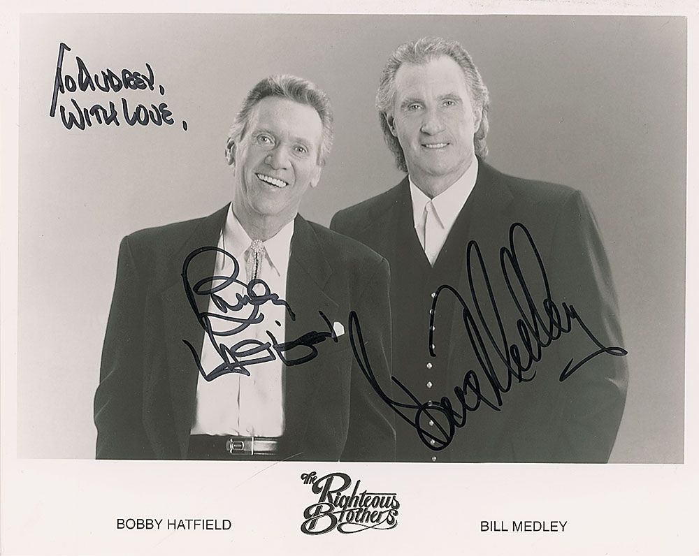 Satin-finish 10 x 8 publicity photo, signed and inscribed in black felt tip, “To Audrey, With love, Bobby Hatfield,” and “Bill Medley.” In fine condition.