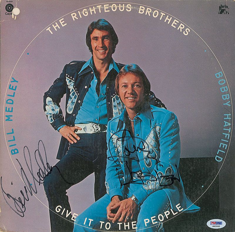 Give It to the People album signed on the front cover in black felt tip by Bill Medley and Bobby Hatfield. A few edge creases, a punch hole to top left, and a PSA/DNA authentication label affixed to lower corner, otherwise fine condition. The record is included.