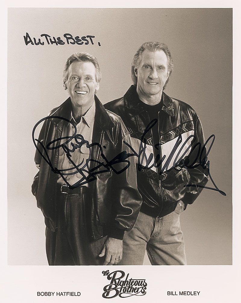 Satin-finish 8 x 10 publicity photo, signed in black felt tip, “All the best, Bobby Hatfield,” and “Bill Medley.” In very fine condition. Accompanied by a letter of provenance from the original recipient which reads, in part, “I have gotten to know Bobby Hatfield & Bill Medley since 1963. I became close to Bobby—we always were going to write a book‚ then ‘Ghost.’”