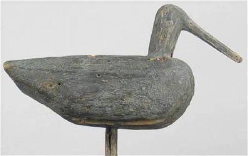 Rigmate to the previous lot. Root head shorebird ca 1860-1880, struck by shot, painted eyes and bill. Two furrows made by insects on the bottom of the body. Original stick. (decoy)