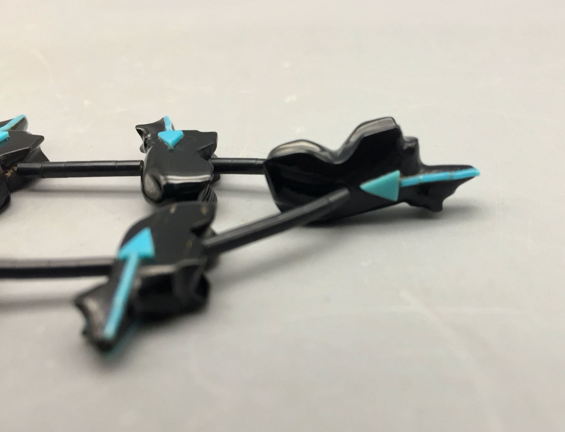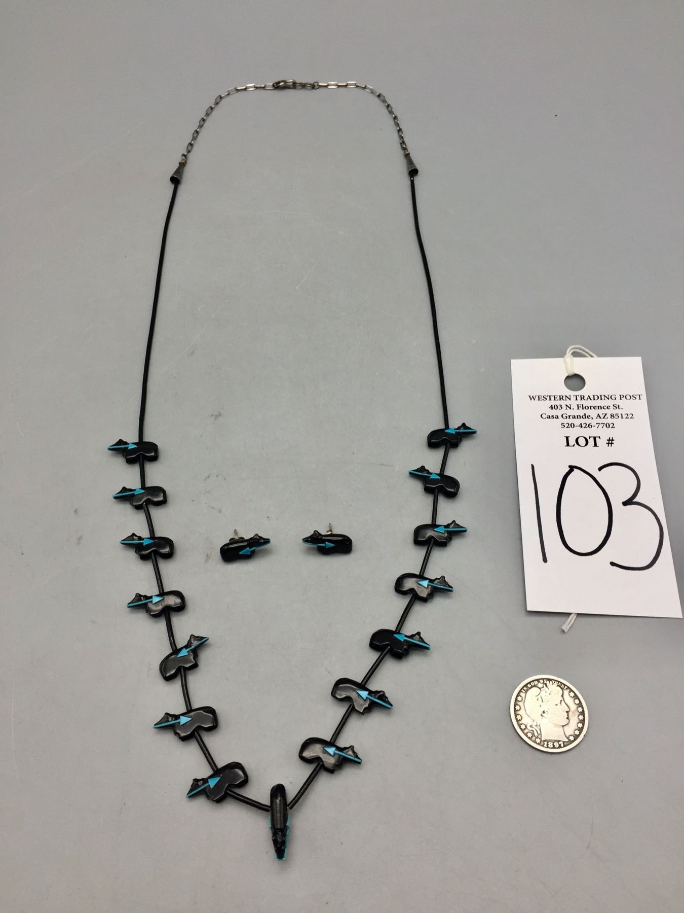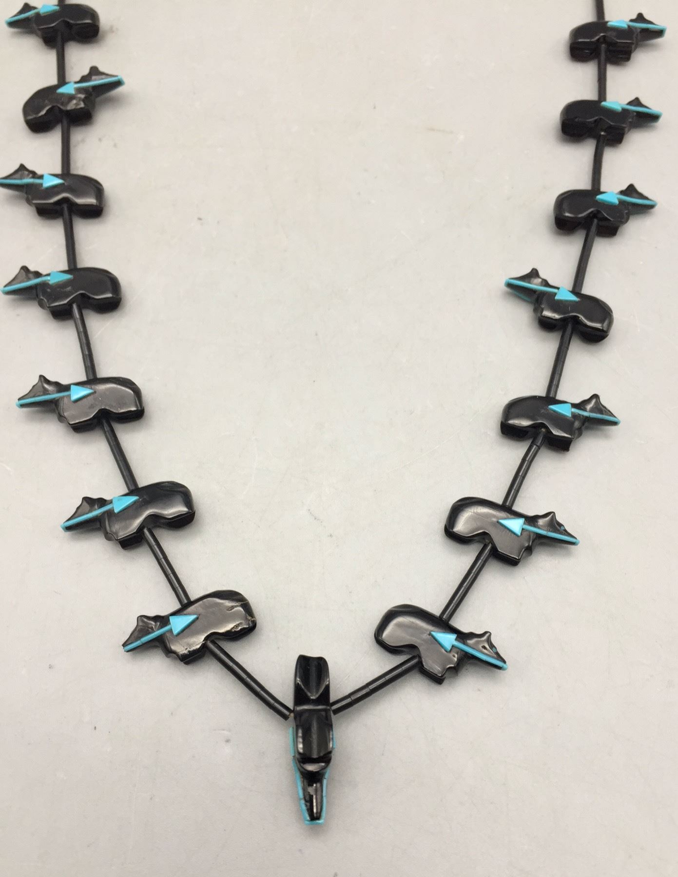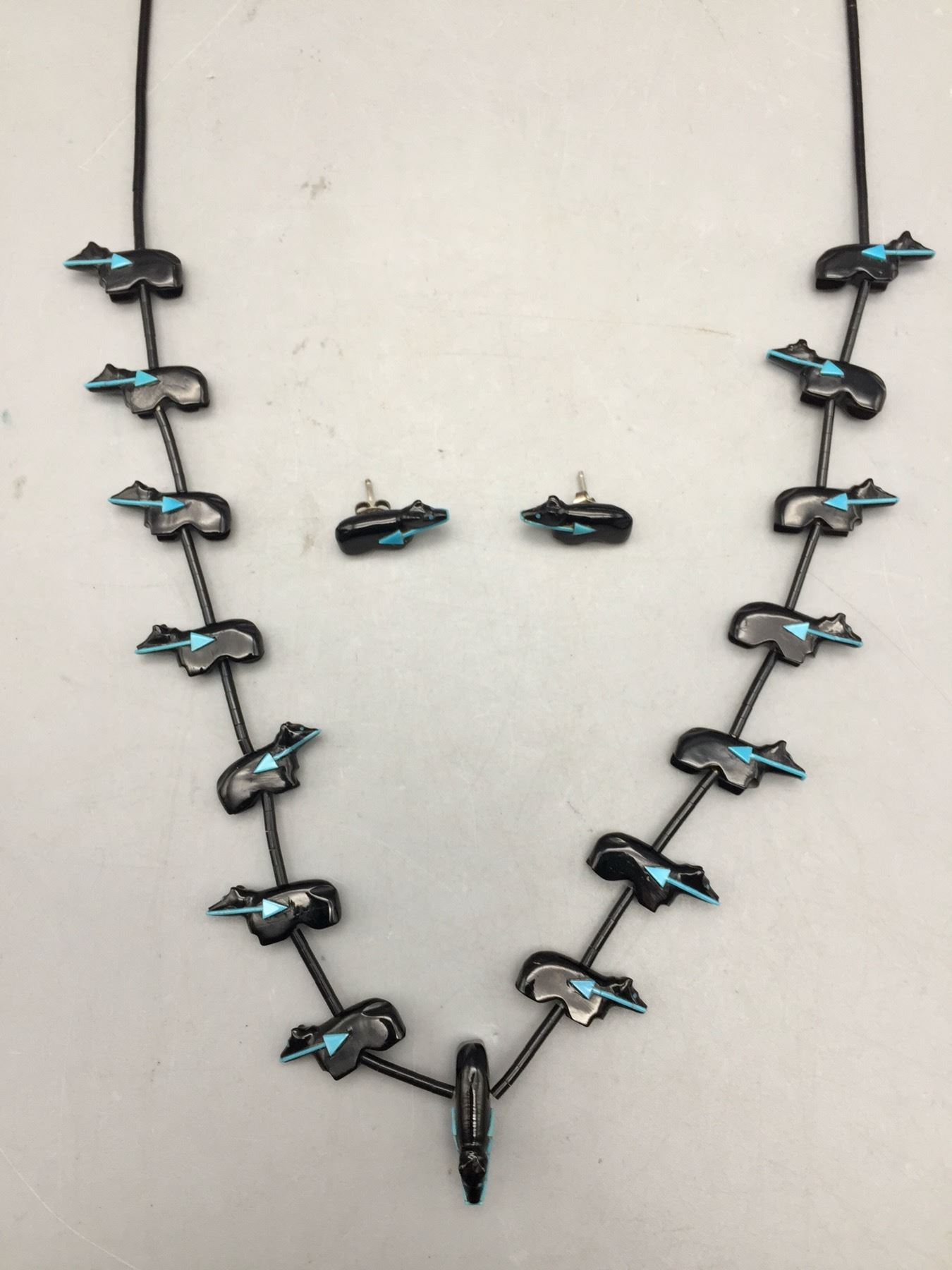 Description: For sale in this lot we offer to you this gorgeous Zuni fetish necklace set featuring black bear fetishes with turquoise heart lines and eyes. There is matching earrings and the findings are sterling silver. Maker: Rignie Boone, Zuni. Approx. Age: Fairly modern. Size: Necklace fits a 31 inch neck. Earrings measure 5/8 inches wide x 1/4 inches long. Weighs 15.3 grams combined. Condition: Good for its age, normal wear expected. Please look closely at the pictures - they are an important part of our description. Shipping: There will be a $5 handling, packaging fee for shipping this lot. The actual cost of postage will be added on top of that.