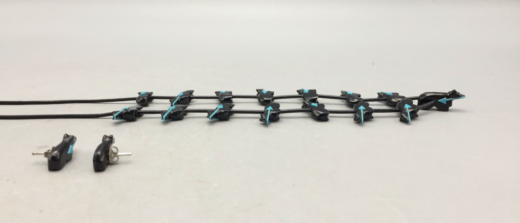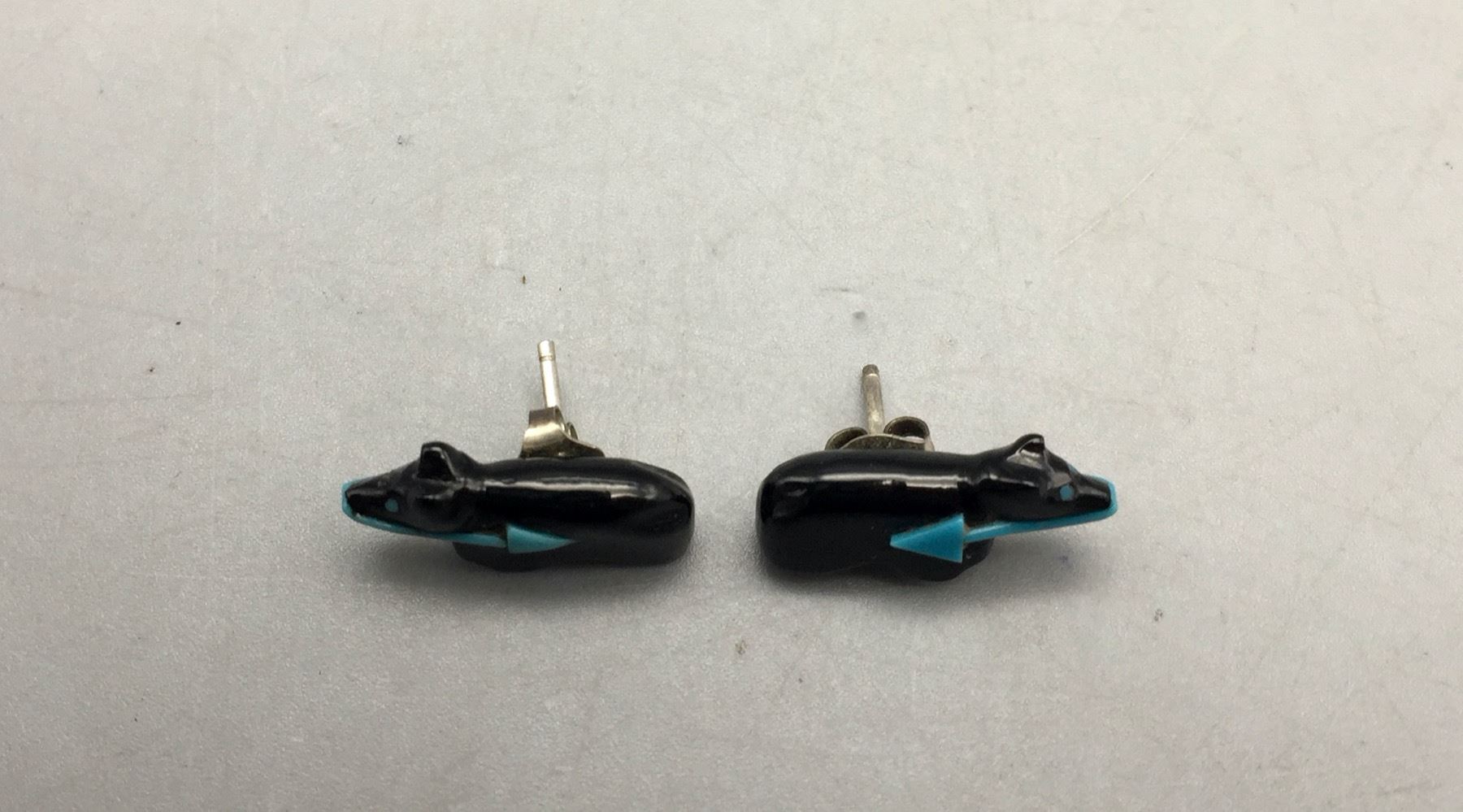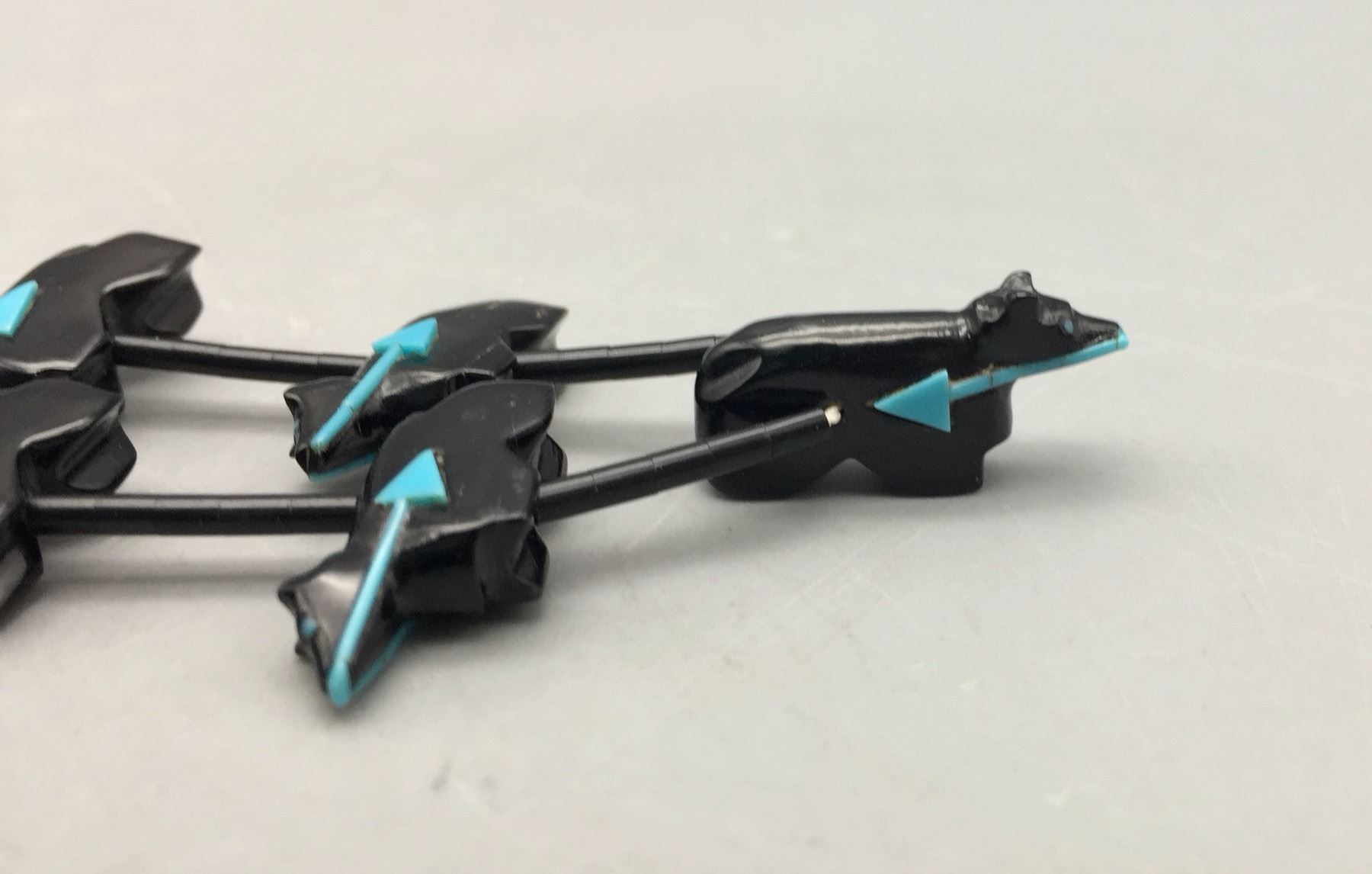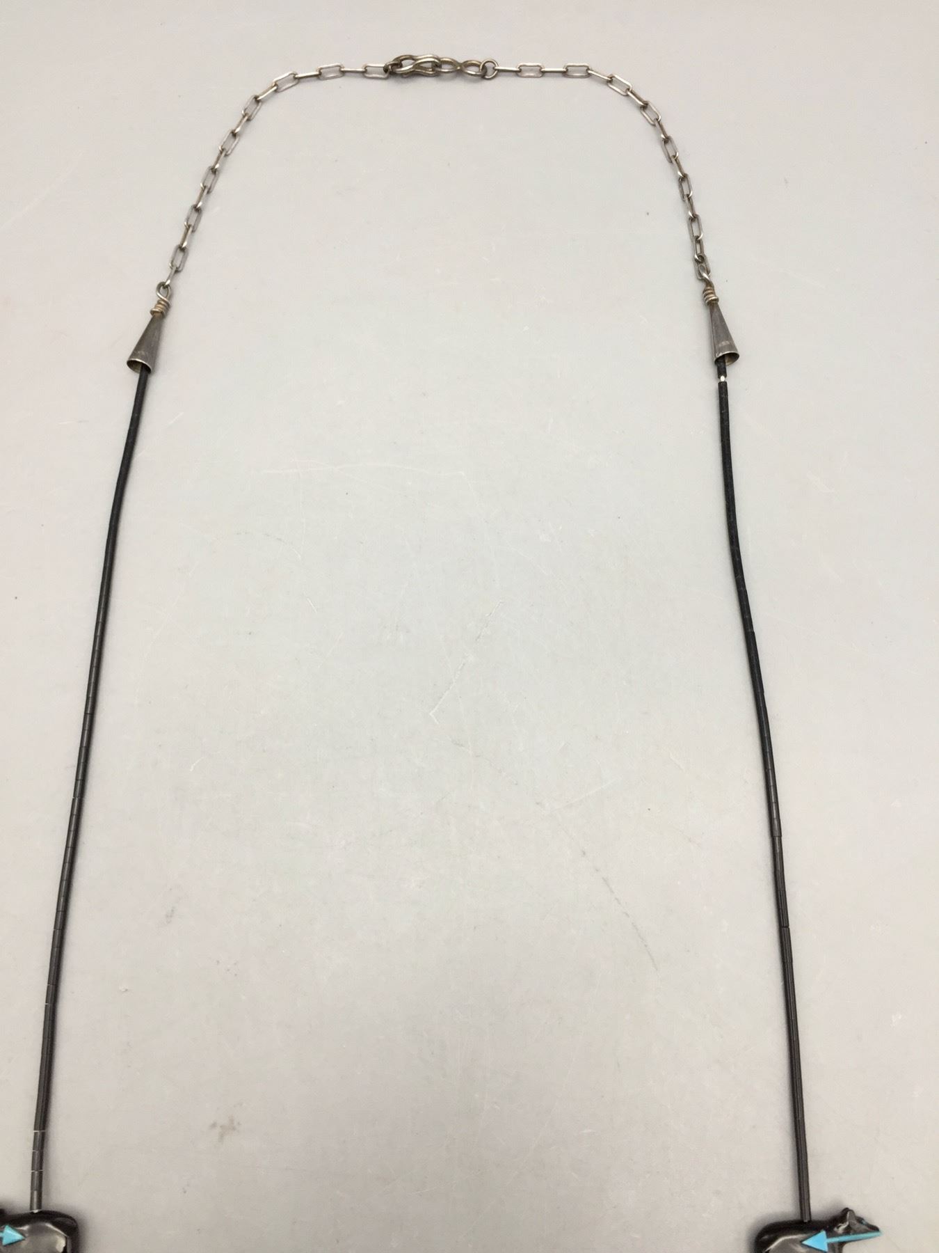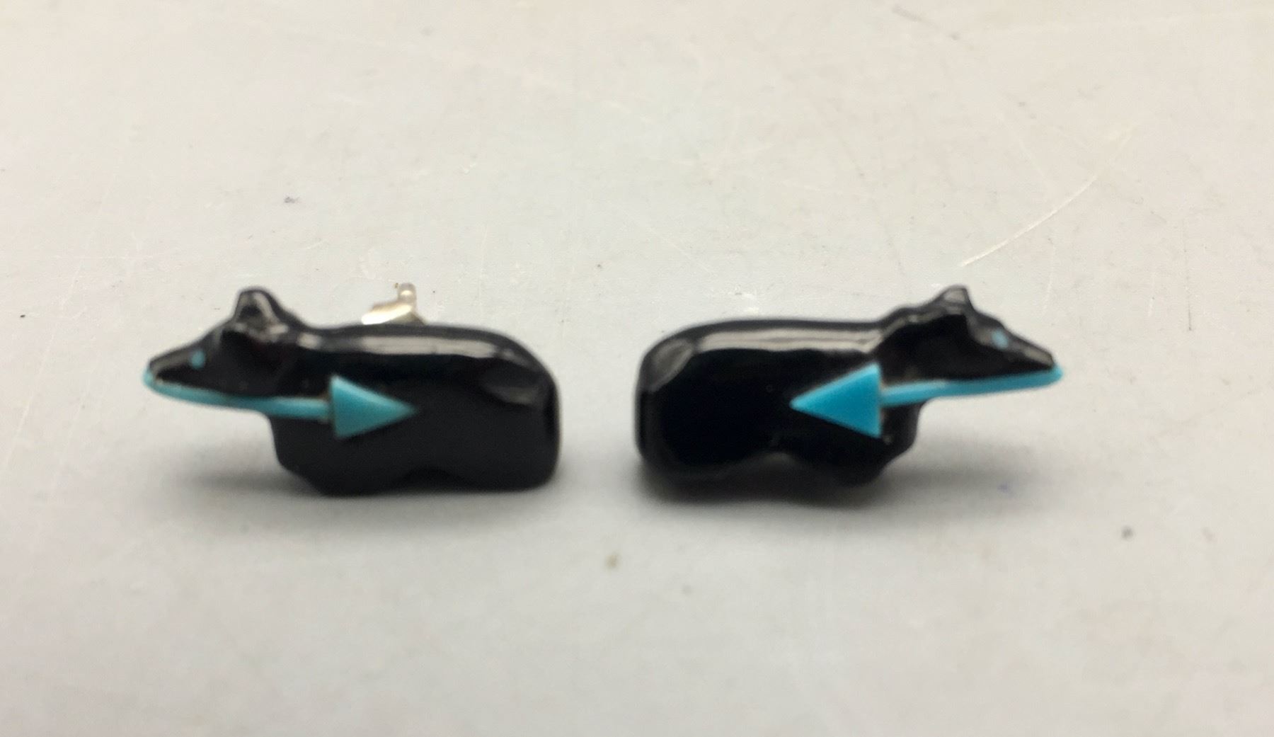 Description: For sale in this lot we offer to you this gorgeous Zuni fetish necklace set featuring black bear fetishes with turquoise heart lines and eyes. There is matching earrings and the findings are sterling silver. Maker: Rignie Boone, Zuni. Approx. Age: Fairly modern. Size: Necklace fits a 31 inch neck. Earrings measure 5/8 inches wide x 1/4 inches long. Weighs 15.3 grams combined. Condition: Good for its age, normal wear expected. Please look closely at the pictures - they are an important part of our description. Shipping: There will be a $5 handling, packaging fee for shipping this lot. The actual cost of postage will be added on top of that.