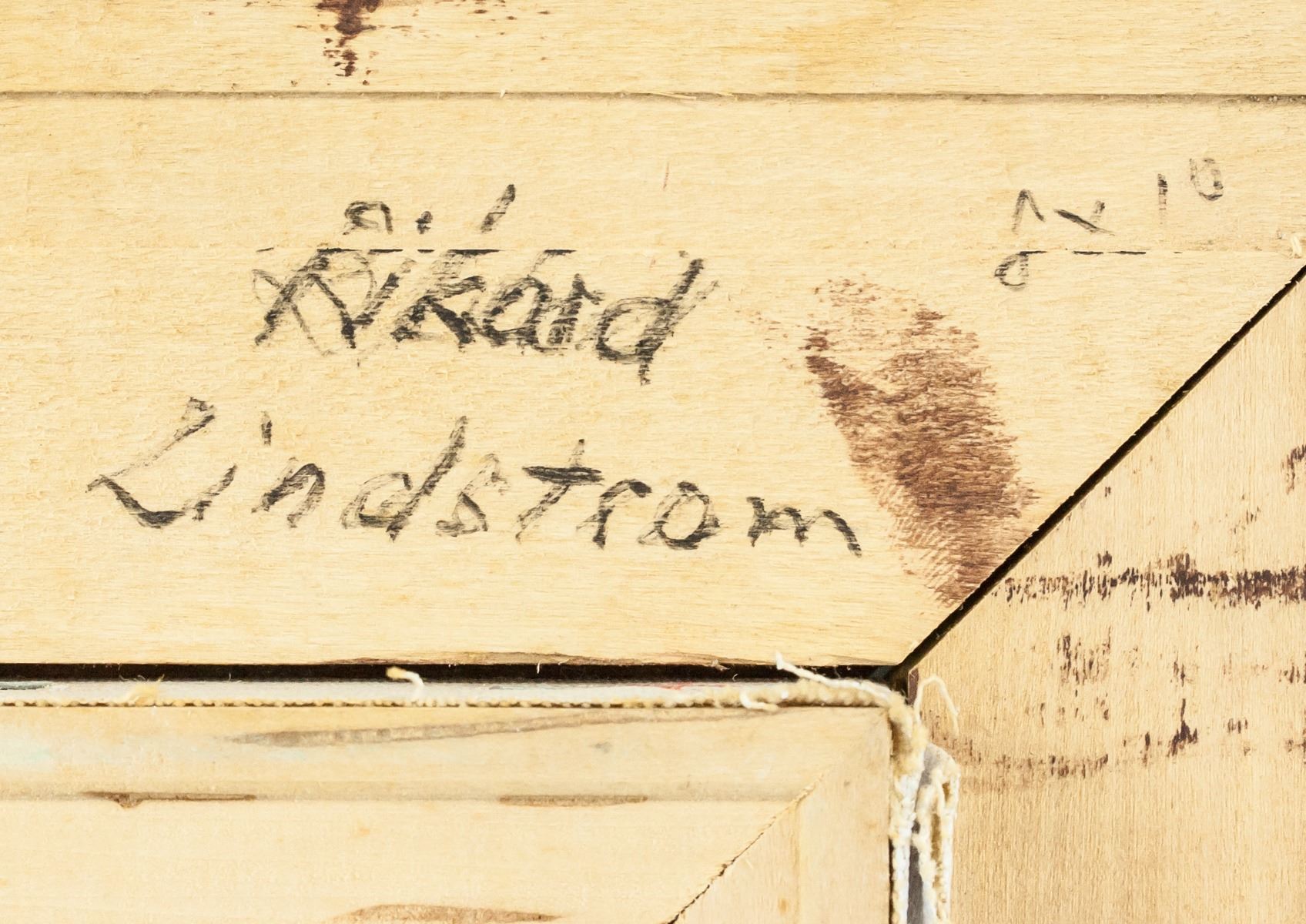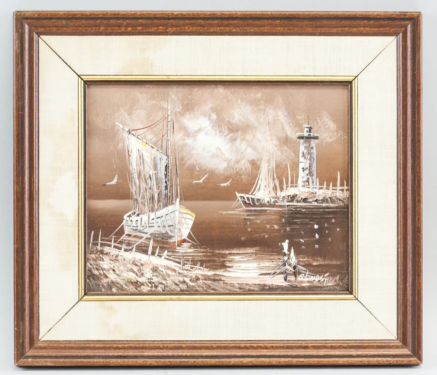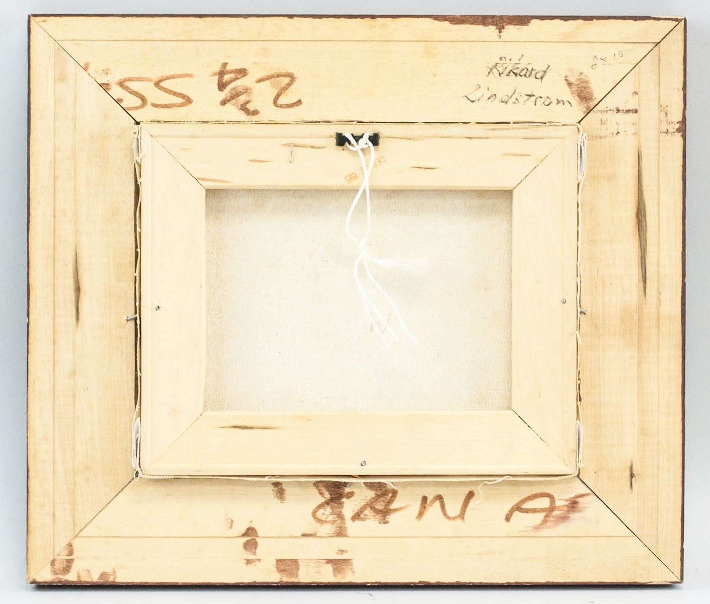 Oil on canvas, framed. Featuring seaside scene with ships with tattered sails and a lighthouse in the background. Signed "R. Lindstrom" to the bottom right. Stamped "SEP 16 1985" on verso. Attributed to Rikard Lindstrom (1882-1943, Swedish). 19 x 24 cm (7.5 x 9.5 in), Frame: 33 x 38 cm (13 x 15 in).