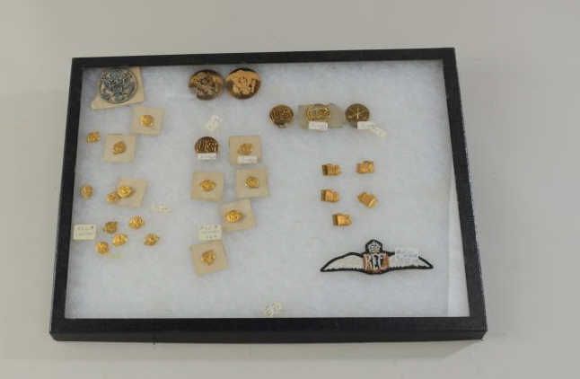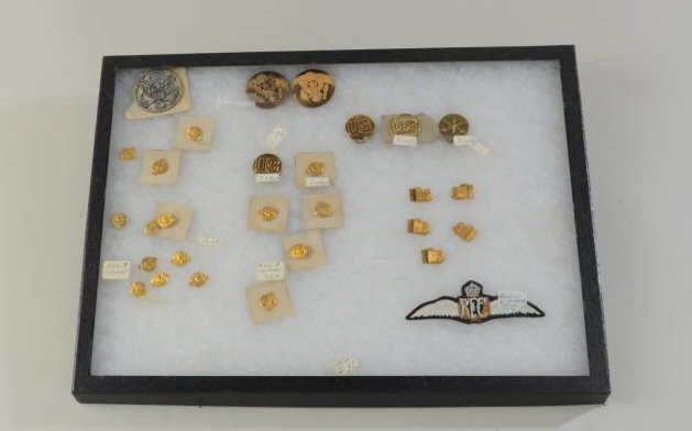 Riker Case full of insignia, 35 pieces along with British Royal Flying Corps. patch. Est.; $75.-$150.