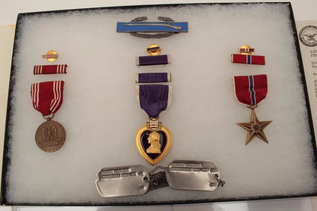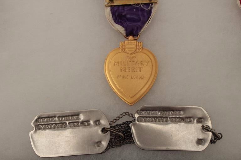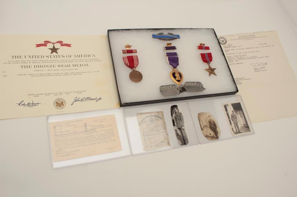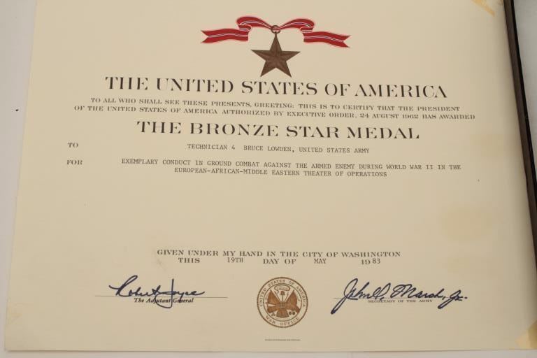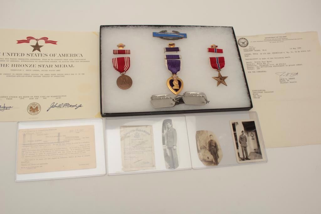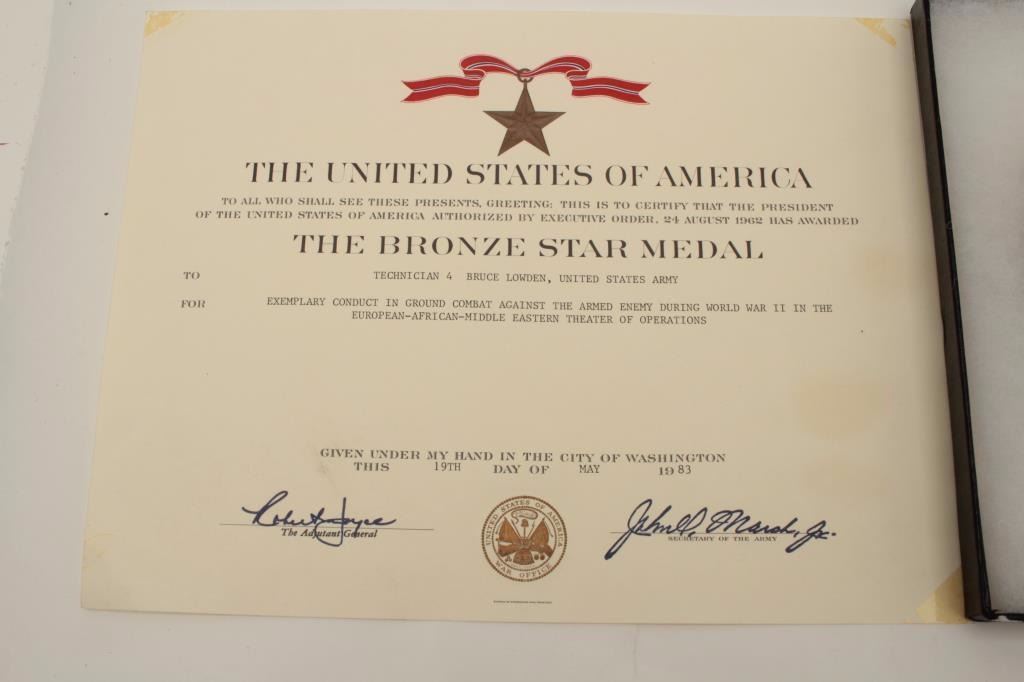 Riker case and documents for Bruce Lowden including dog tags, Bronze Star and Purple Heart (WW II). Also several photos of Lowden in uniform. Should be further researched. Est.: $125-$250.