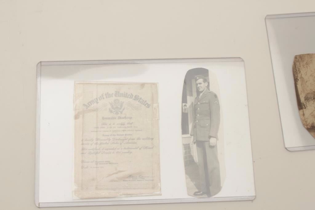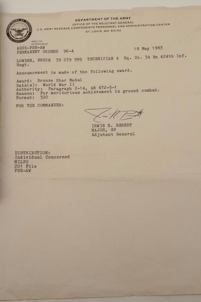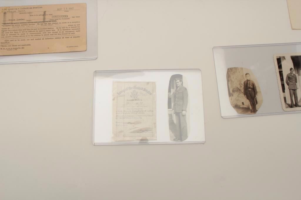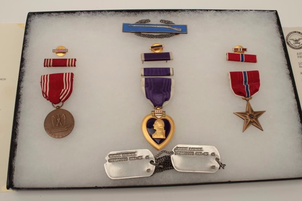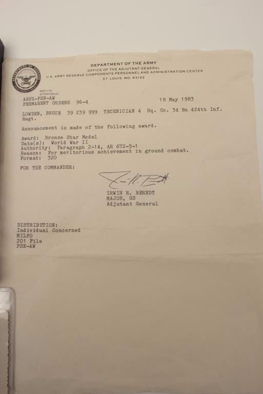 Riker case and documents for Bruce Lowden including dog tags, Bronze Star and Purple Heart (WW II). Also several photos of Lowden in uniform. Should be further researched. Est.: $125-$250.
