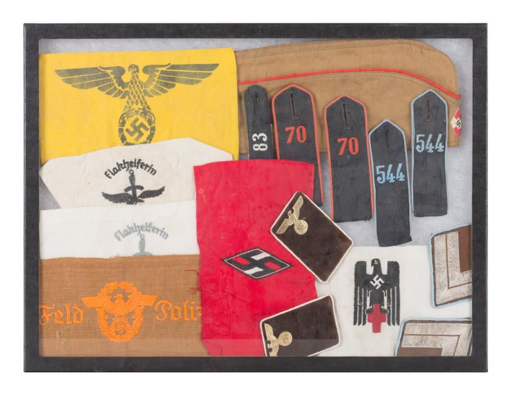 Riker case containing lot of authentic World War II period German memorabilia as described. Number 1 Hitler youth soft cap in good condition with patch. Number 2 is 6 armbands from Hitler youth, Red Cross, field police, two Air Force, oneunidentified showing Nazi Eagle on yellow background. Brown velvet collar tabs with Eagles possible SA 4 and NSDAP and 5 epaulets from various Nazi organizations. Est.: $175-$350