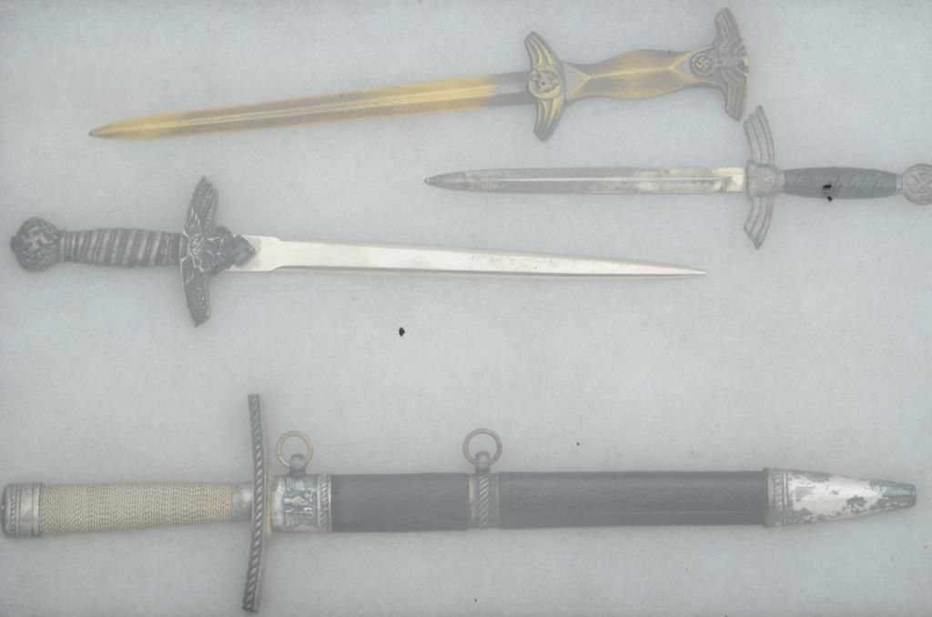 Riker case of 4 miniature well made older nazi daggers, one with a sheath. Est.: $100-$200.