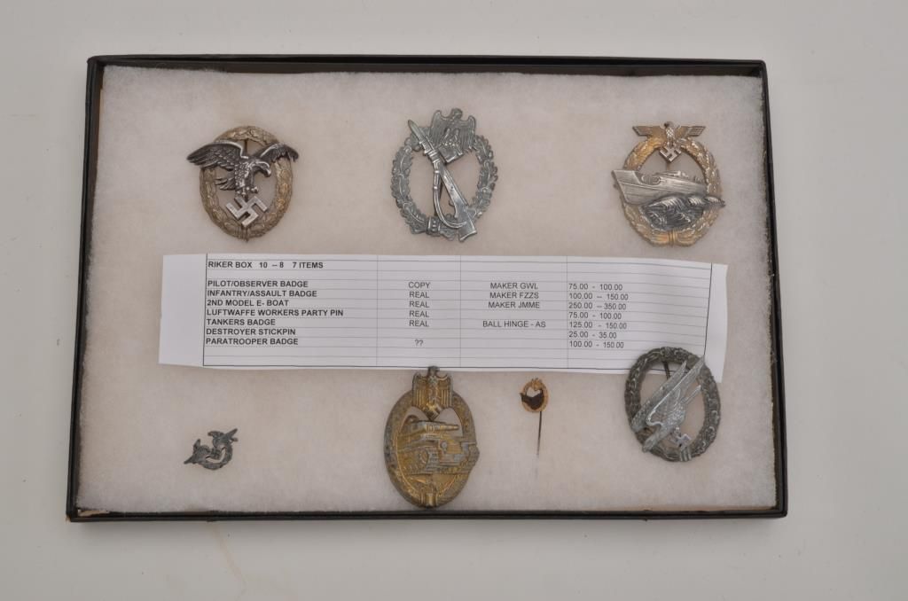 Riker case of 7 various nazi badges and pins including an infantry/assault badge, a 2nd model E-boat, Luftwaffe workers party pin and Tankers badge; also a copy of a pilot/observer badge. Est.: $350-$700.