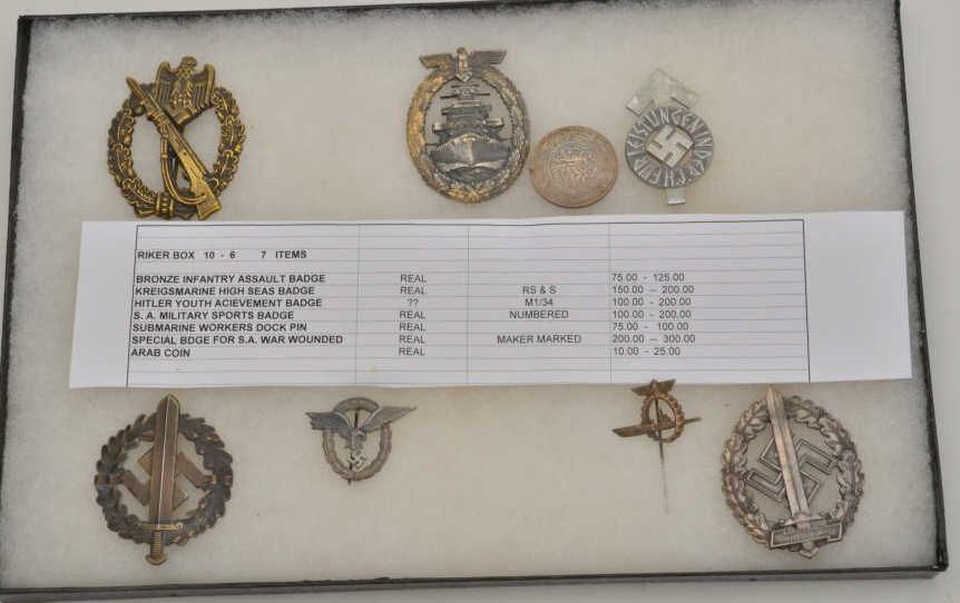 Riker case of 8 nazi badges, pins and a coin including a bronze infantry assault badge, a kreigsmarine high seas badge, an S.A. military sports badge, a Submarine Workers dock pin, and a Special badge for S.A. warwounded. Est.: $300-$600.