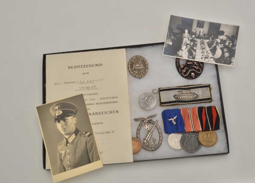 Riker case of medals and badges from German officer Johannes Meyerhoff with photo of him in uniform, at a formal dinner and a 1944 document. Est.: $250-$500.