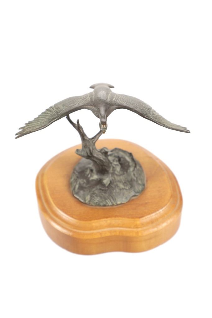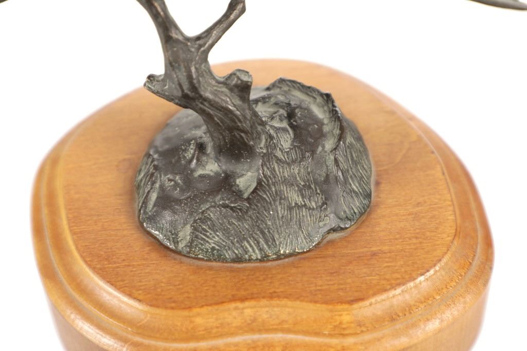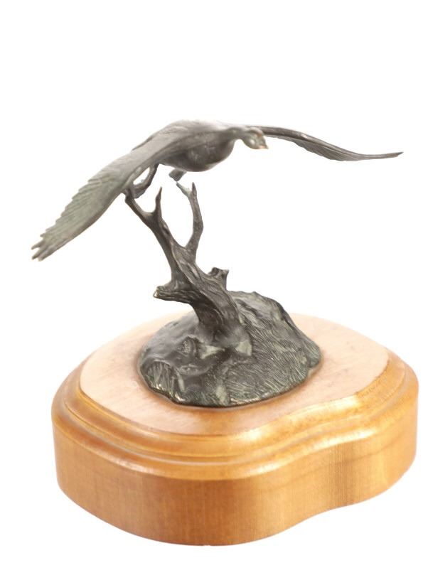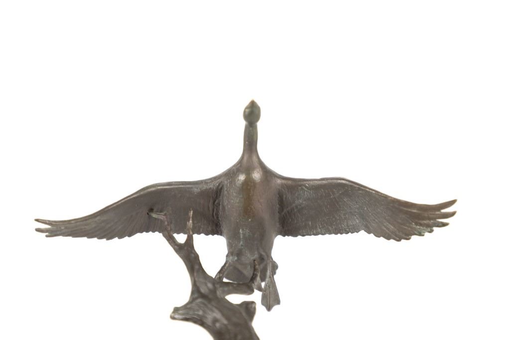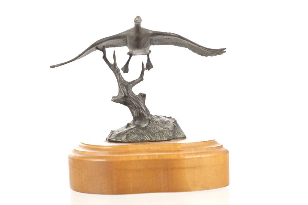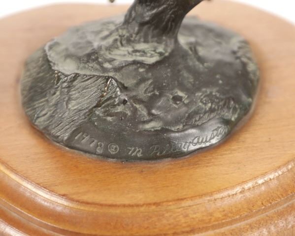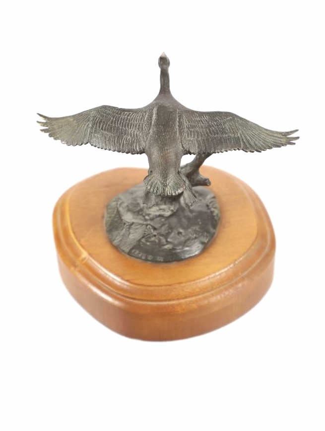 Featured in this lot is this Riley Austin "Flying Canadian Goose," Bronze circa 1978. The sculpture features a wonderfully and professionally crafted bronze construction tat shows a flying Canadian goose swooping over a branch protruding from the ground. The bronze is mounted on a hardwood shield and is marked as follows: 1978 - 7/10 - Riley Austin. The condition of this bronze sculpture is good with a slight patina adorning the outside of the bronze but otherwise shows good overall condition. The measurements of this bronze sculpture is 6 1/8" x 5 3/4" x 5". The collective weight of this bronze sculpture is 1lb 10oz.