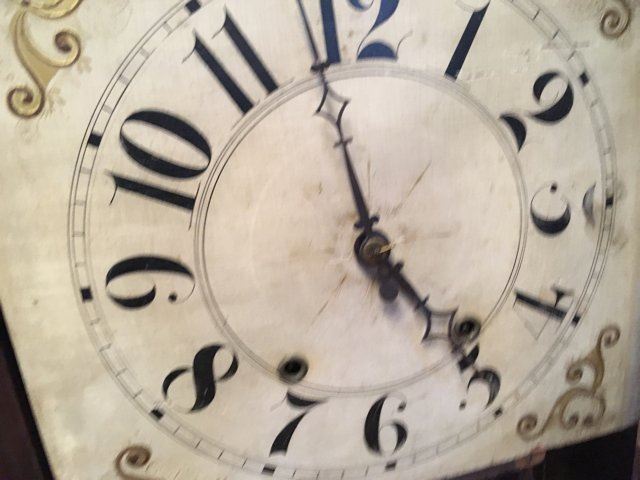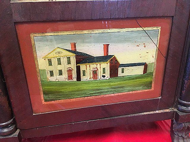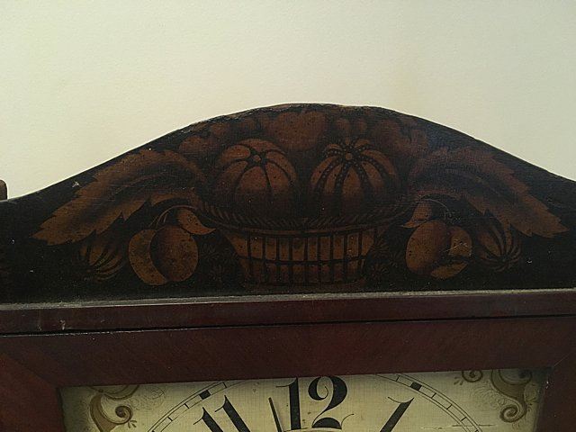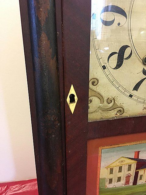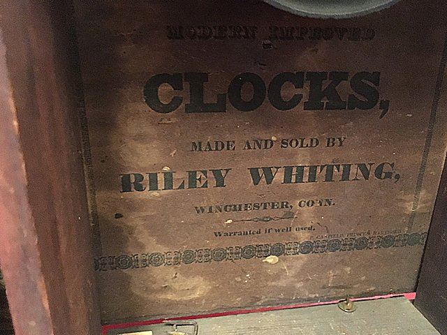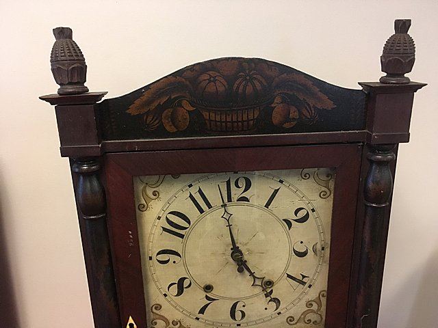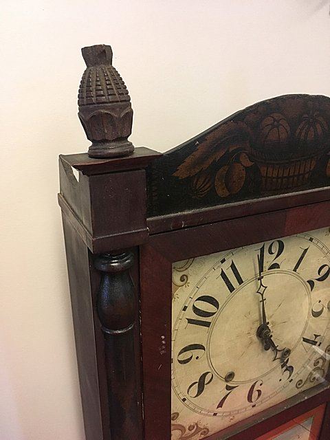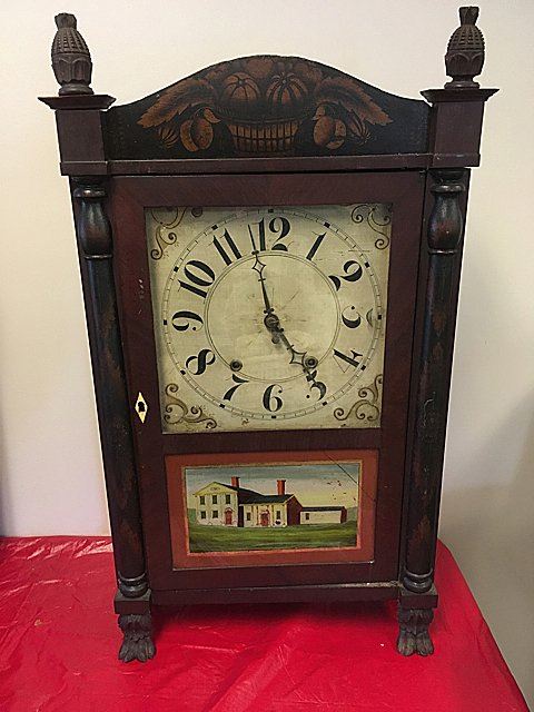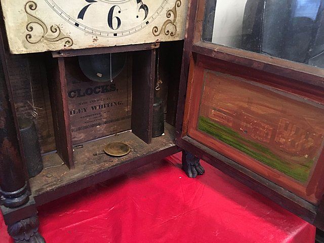 Riley Whiting Column and Splat Shelf Clock, Winchester, Connecticut, early 1800's mahogany case with half columns, stenciled columns and splat. Fruit and flowers on splat, claw feet, pinapple carved finials, hand painted dial. Beautiful label, "Modern Improved Clocks Made and Sold by Riley Whiting, Winchester, Conn.", wooden works, weight driven, reverse painted glass tablet (has crack). Measures approx. 30" tall x 17" wide x 5 1/2" deep.