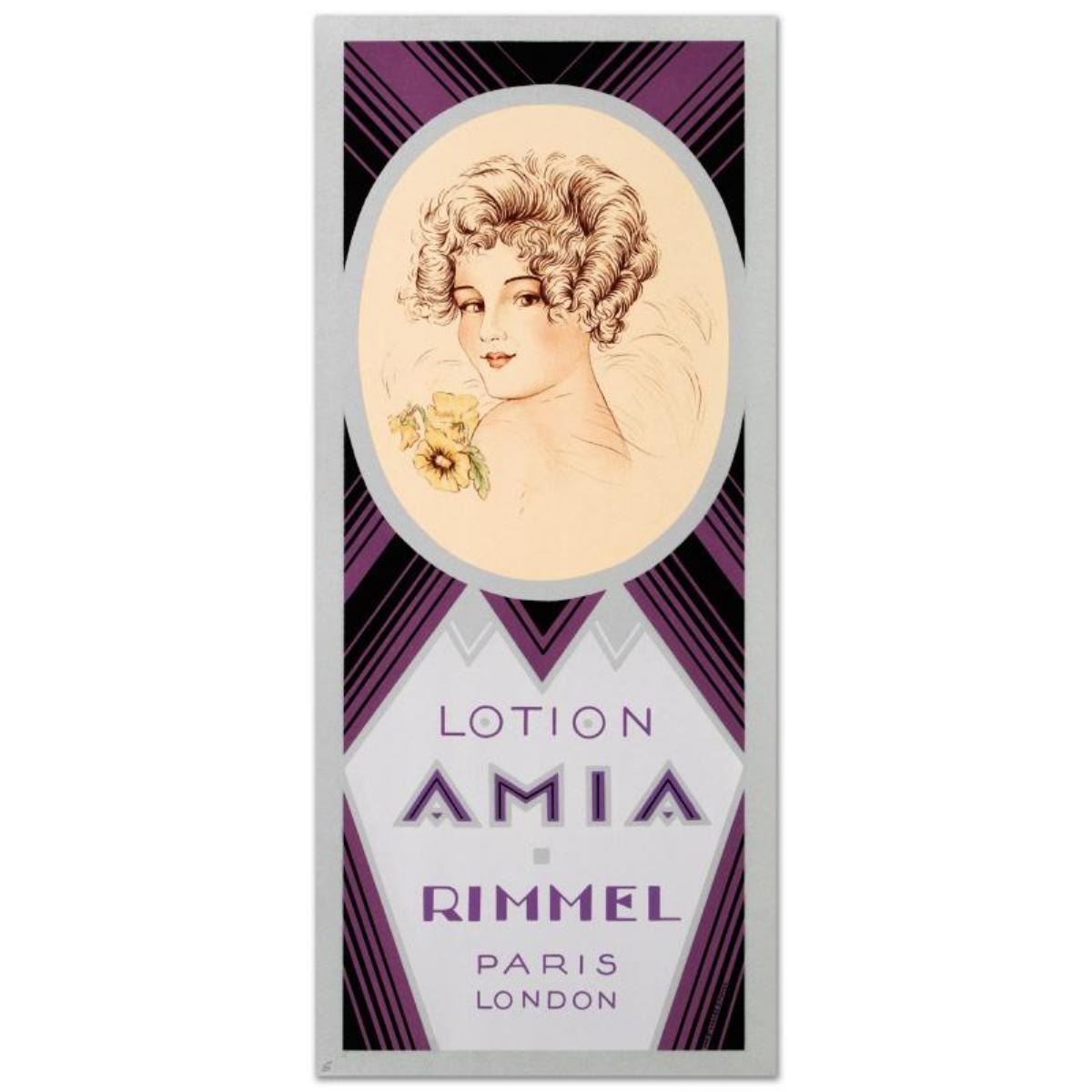 "Rimmel-Lotion Amia" is a hand pulled lithograph on paper by the RE Society. Includes letter of authenticity. Measures approx. 10.5" x 23.5" (with border), 9" x 22.5" (image).