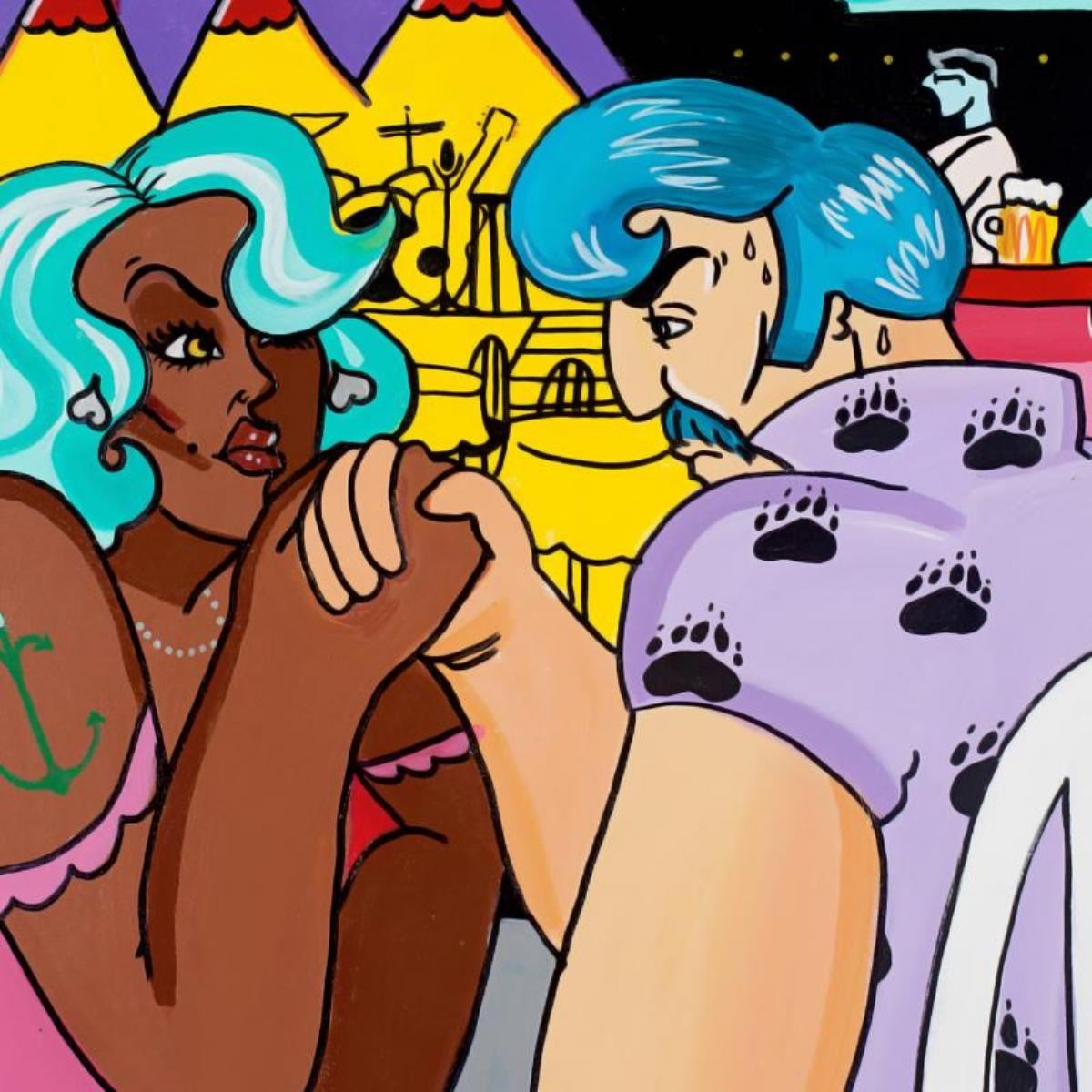 "Arm Wrestling" is an Original acrylic painting on Canvas by Rina Maimon. The piece comes hand signed and is accompanied by a Certificate of Authenticity. Measures approximately: 24" x 24.5".