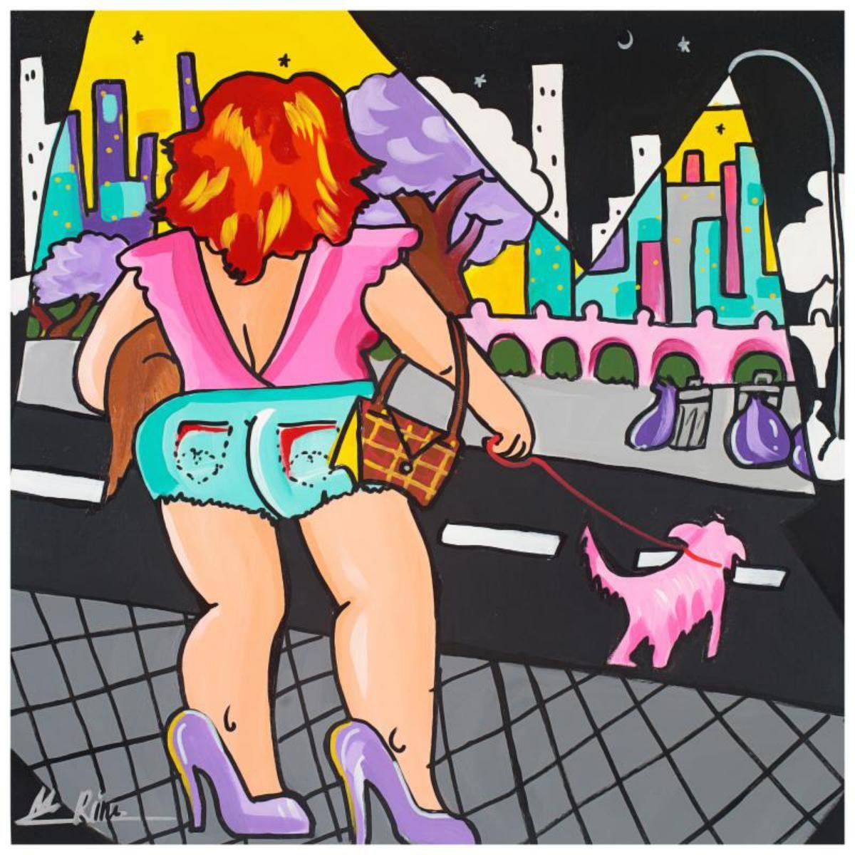 Rina Maimon, "Walking the Dog" Original Acrylic Painting on Canvas; Hand Signed and with COA