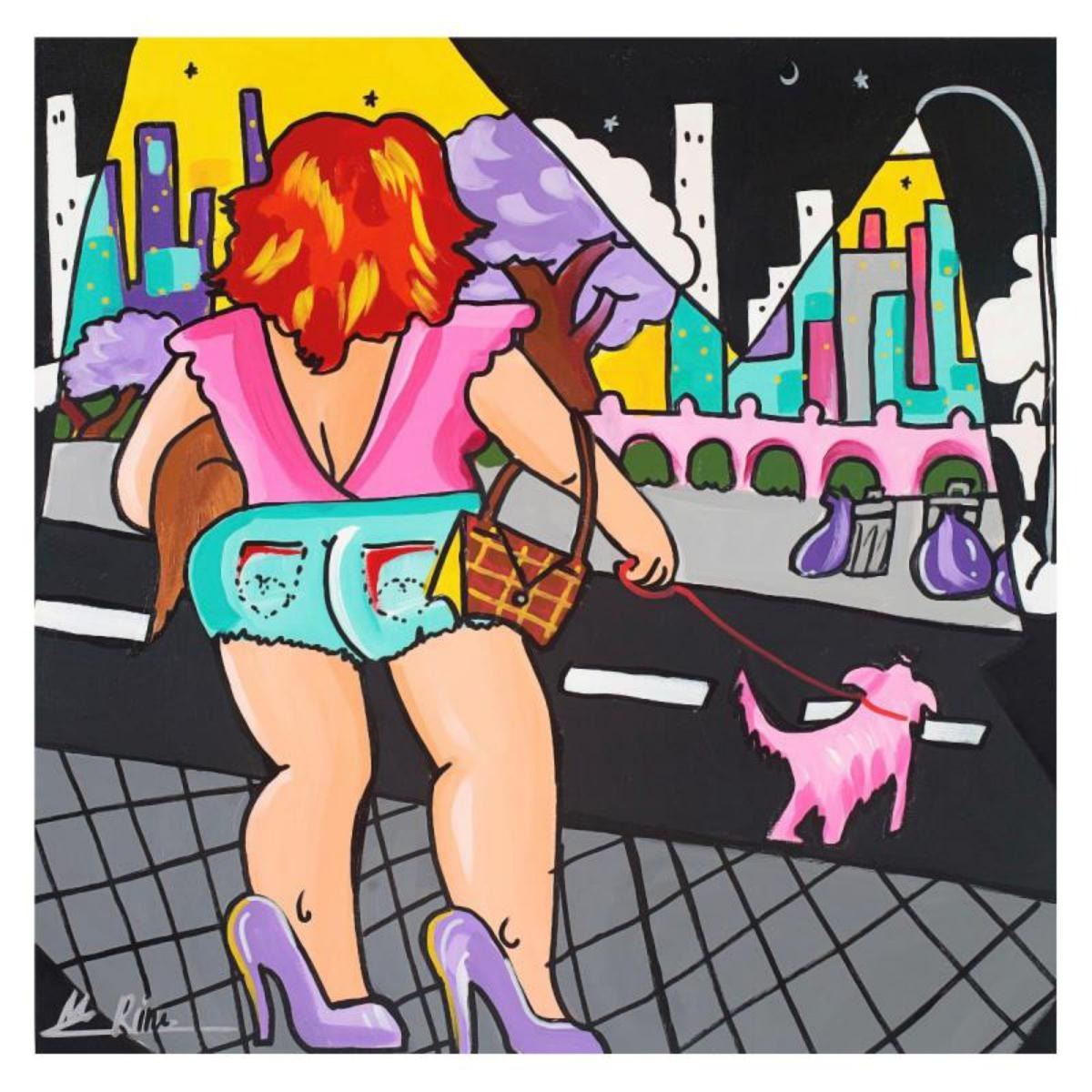 Rina Maimon, "Walking the Dog" Original Acrylic Painting on Canvas; Hand Signed and with COA