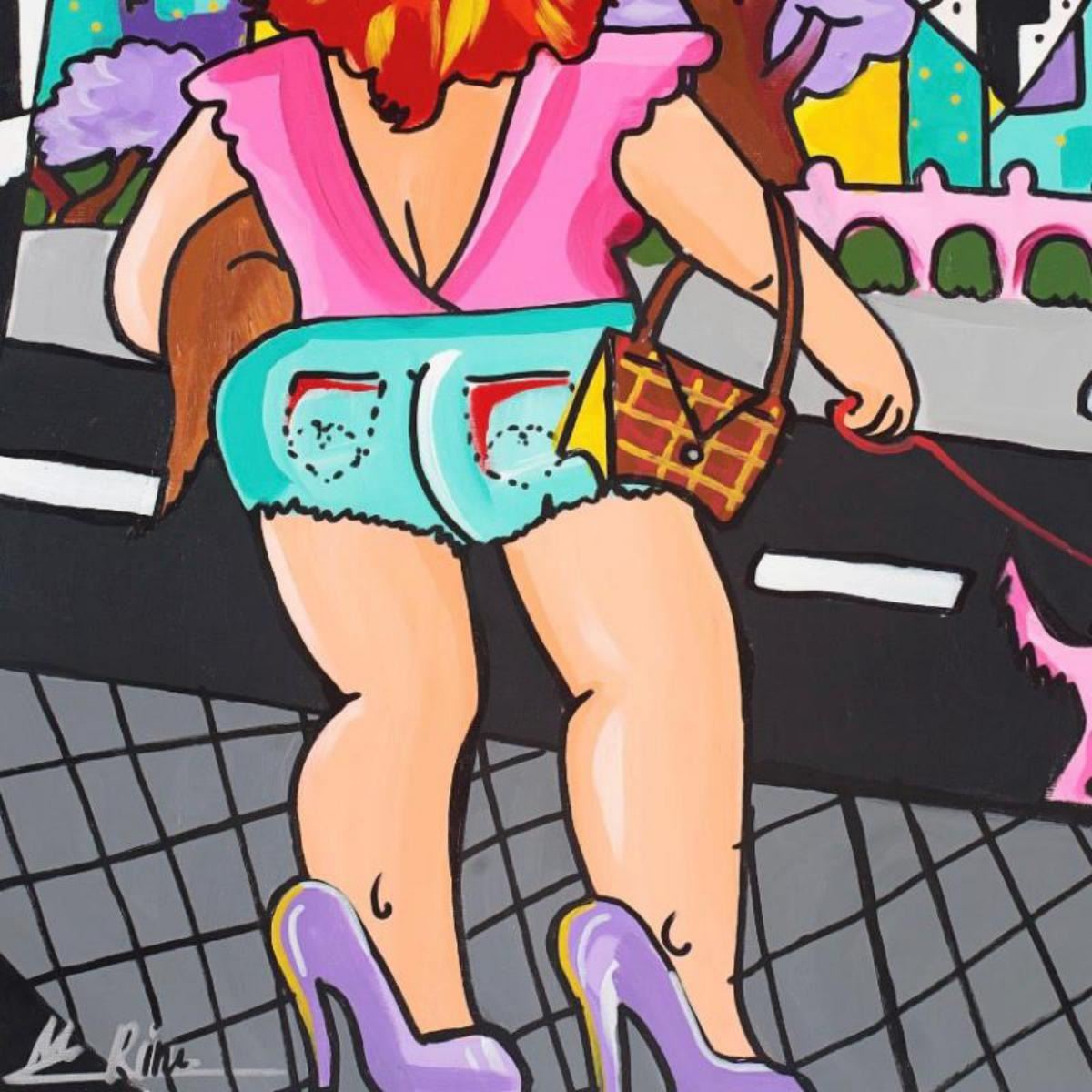 "Walking the Dog" is an Original acrylic painting on Canvas by Rina Maimon. The piece comes hand signed and is accompanied by a Certificate of Authenticity. Measures approximately: 24" x 24". Reference #: 225105