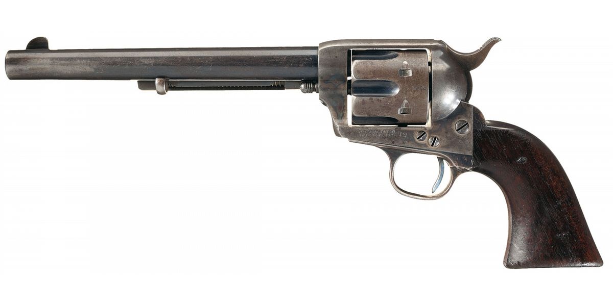 Colt U.S. Contract Single Action Cavalry Model revolver manufactured in 1891. This very late production revolver is stamped with the "R.A.C." mark of Ordnance sub-inspector Rinaldo A. Carr on the underside of the barrel, bottom of the frame and side of the cylinder. The "U.S." property mark is stamped on the left side of the frame behind the patent markings. "P" proofmarks are stamped on the underside of the barrel and on the side of the cylinder. The barrel is roll-stamped with the 4th style elongated block legend "COLT'S PT. F.A. MFG. Co. HARTFORD CT. U.S.A.". The left side of the frame is roll-stamped with the late Colt two-line/three-date patent markings adopted in 1890 around serial number 134,000. The inside of the loading gate is stamped with the assembly number "1964". A Colt "K" sub-inspection mark is stamped on the trigger guard behind the serial number and in the hammer well above the firing pin hole. The full serial number, "140070" is visible on the frame, trigger guard and back strap. The partial serial number, "0070" is stamped on the side of the cylinder and written in pencil on the inside of the grip. All of the visible serial numbers match. The revolver has the late pattern oval ejector rod head adopted around serial number "113000" and used until the end of U.S. contract production at serial number "140361". The revolver has the Colt blue finish on the barrel, ejector housing cylinder, trigger guard and back strap. The frame, hammer and loading gate have a color casehardened finish. The one-piece black walnut grip is oil-finished. This is one of the very last examples of a Single Action Cavalry Model revolver manufactured by Colt. Most of these late production revolvers were altered to 'Artillery' configuration between 1896 and 1903; original unaltered examples of Colt Single Action Cavalry Model revolvers are scarce.