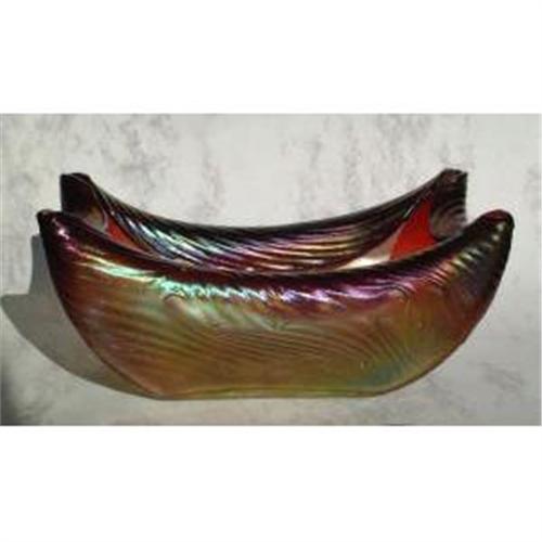 This is the first I have had of this shaped Rindskopf, and most likely it is a rare example of their fabulous workmanship. I believe it to be a celery dish. The size is 9 1/5"" x 5"" and 4 1/2"" tall. The colors have that oil on water appearance and irridesence. The outside design on that glass is very unusual, and as you run your fingers over it, you can feel the glass was hand worked with special tools, because the glass, in some areas, is in relief. The top rims are rolled smooth and the entire top is gently folded over, inwards. There is a large polished pontil.