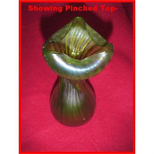 </font></strong>This 6-3/4" tall unsigned hand blown art glass vase was probably a piece of Rindskopf. Iridescent green ribbed glass with pinching and twisting. Very good condition with NO chips or cracks. Unfinished pontil. I bought this serveral years ago from a Midwestern antique shop.</font>
