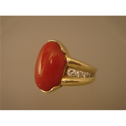 </font></strong>This is one of the most stylish coral rings that I have seen! It is handmade in 18 ct. yellow gold. It has a wonderful oxen red center coral stone (circa 10 cts.) Descending down each shank of the ring are 5 graduated sparkling diamonds ( a total of 0.55 ct. grade S1) It is German circa 1980. The quality and condition are excellant. The U.S.A. size is 7 and the continental size is 54. A fabulous ring! </font>