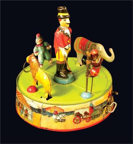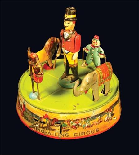 Very Rare Ring-A-Ling Circus Tin Wind Up Toy, Louis Marx and Co. NY. Excellent Condition. 8 inch diameter X 8 inches tall.