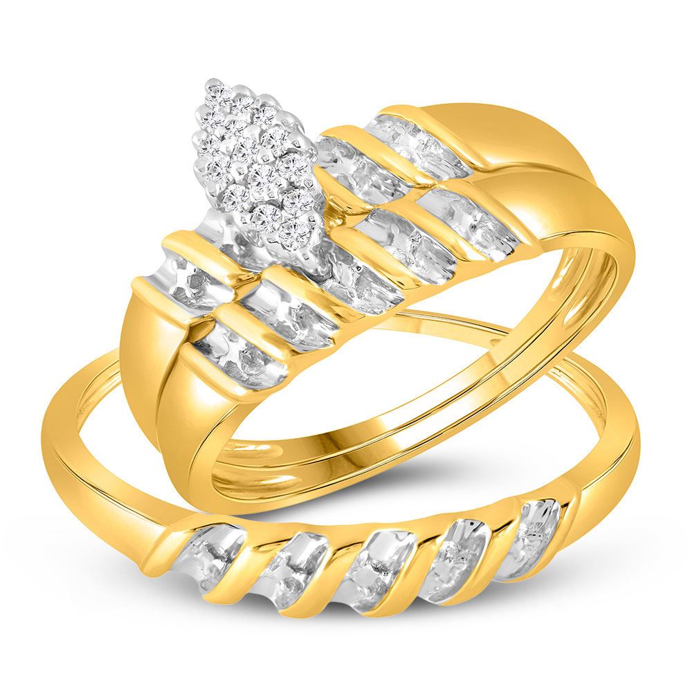 10k Yellow Gold Diamond Marquise-shape Cluster Bridal Wedding Trio Mens Womens Ring Band Set.