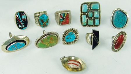 Late 1900s, Collection of ten great Navajo/Zuni rings, plus a spoon and gemstone pendant. All in very good condition. By makers; Roger Apachito, F. Charley, M. Laate, etc. 5-1/2 to 12-1/2