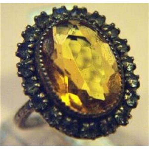 [4125.130/24x0v159] </td></tr><tr> <td> </td></tr><tr> <td>Reference #: RngGldFact</td></tr><tr><td>Condition:Good, Please see text</td></tr><tr><td>Year:1900s +/- [early]</td></tr><tr><td>Country:USA</td></tr><tr><td>Height:3/4in long x 7/8in wide x 3/8in high</td></tr><tr><td>Title:Ring Golden Facated Stone w/19 Surrounds </td></tr><tr><td>Style:Large facated Stone surrounded by smaller stones</td></tr><tr><td>Materials:Gemstone, Sterling</td></tr><tr><td>Type:Ladies Fashion Accessory, Vintage Ring / Jewelry</td></tr><tr><td>Location:Central Texas</td></tr></table>